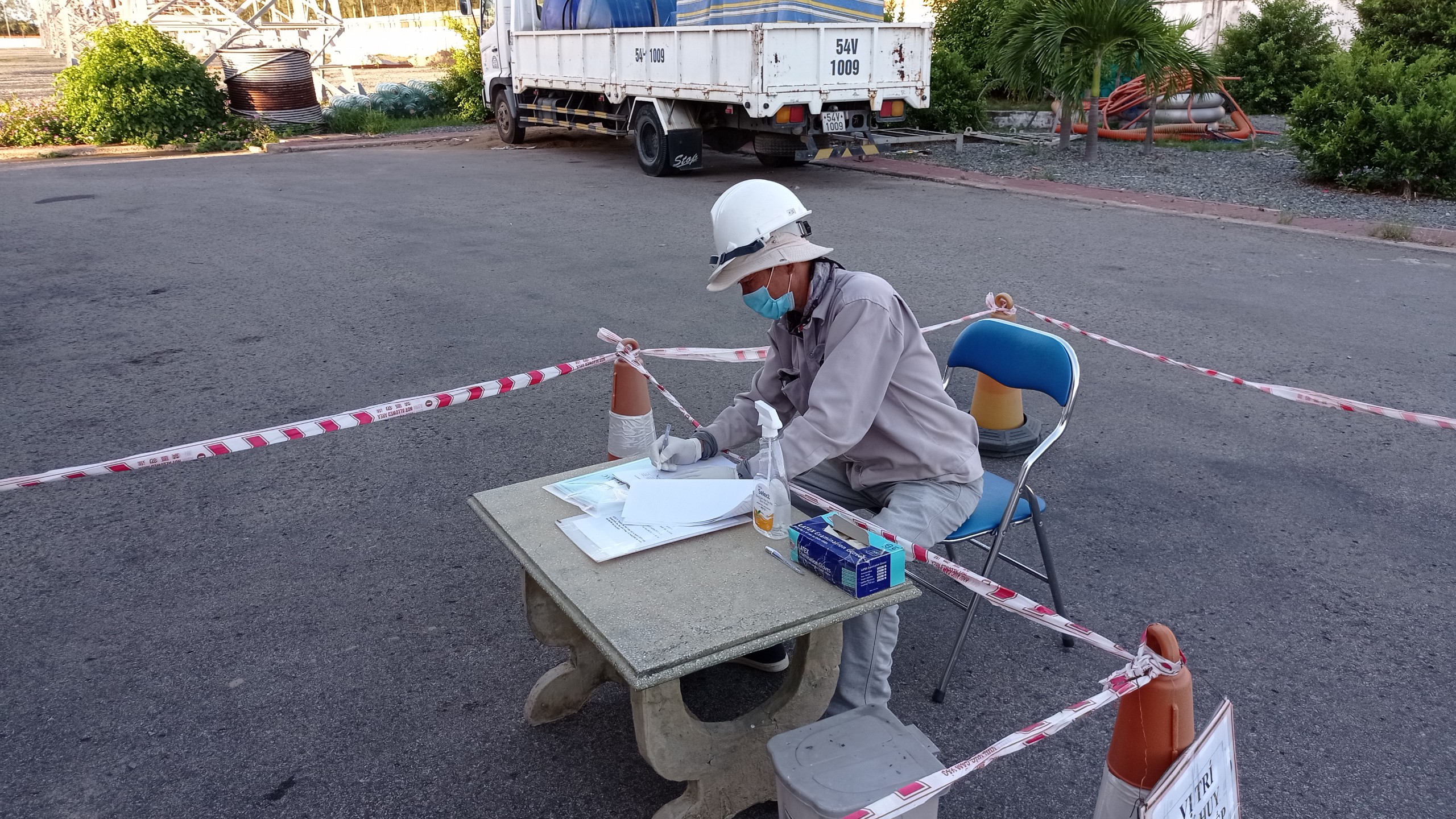 Trạm bố trí bàn làm việc với nhóm công tác phía bên ngoài phòng điều hành, có rào cách ly. Trên bàn trang bị nước khử khuẩn, găng tay, bìa công tác. Khi có công tác đến, bảo vệ cổng sẽ kiểm tra nhiệt độ cách thành viên nhóm công tác và bắt buộc phải có khai báo y tế trước khi đăng ký công tác, kiểm tra nhóm công tác trang bị bảo hộ lao động, đeo khẩu trang đầy đủ.