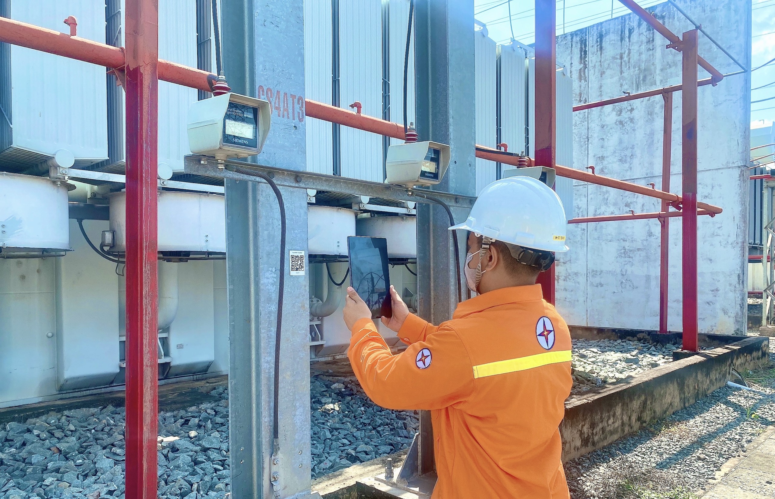 CBCNV Trạm Tân Định đang quét mã QR kiểm tra thiết bị định kỳ hàng tuần