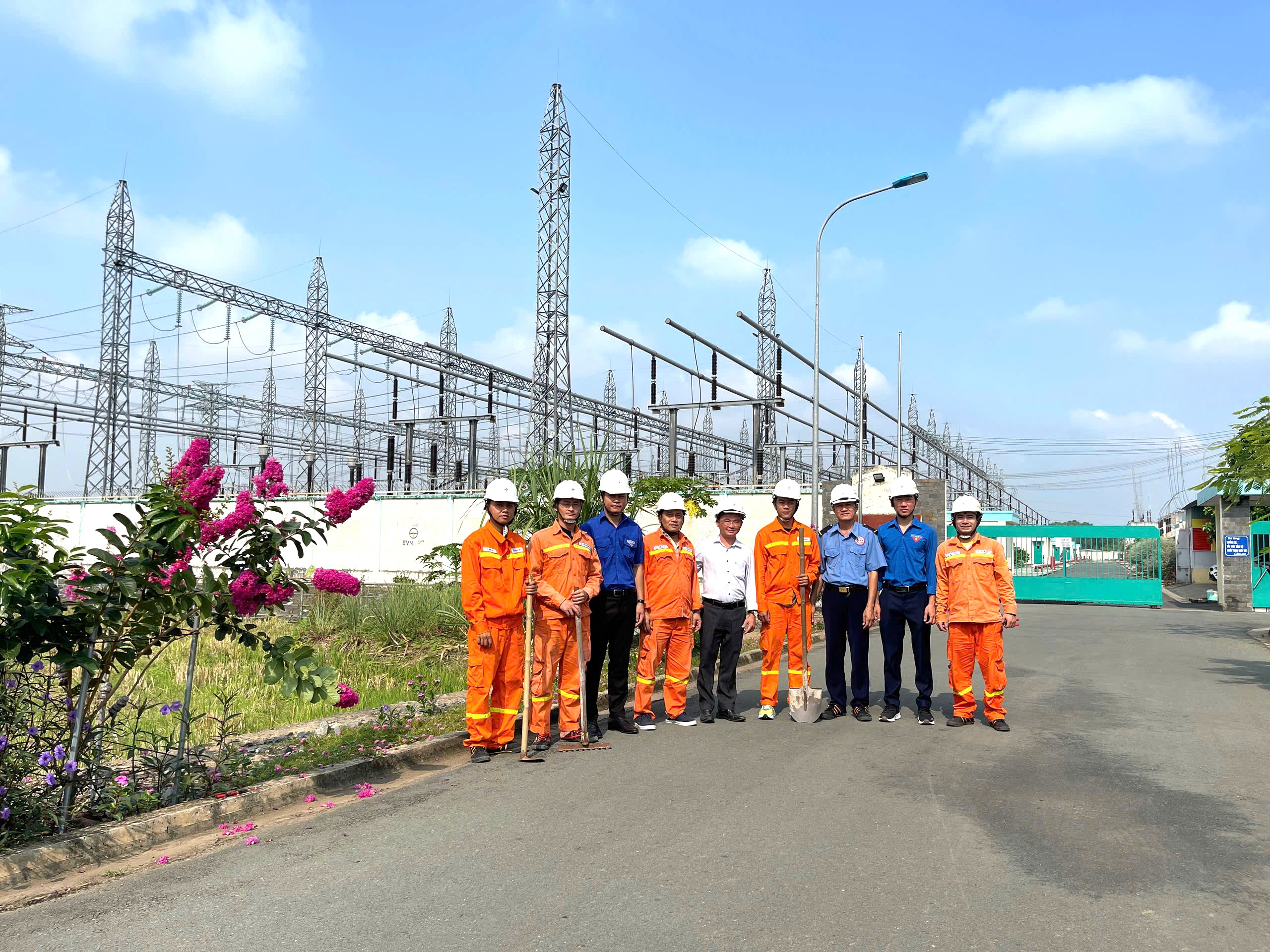 Ông Nguyễn Tiến Hữu- Trưởng trạm 500kV Tân Uyên và đoàn viên thanh niên của Trạm 500kV Tân Uyên