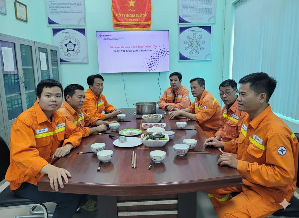 Thực hiện kế hoạch chăm lo cho đoàn viên, người lao động nhân dịp Tết Nguyên đán Bính Ngọ 2026 của Công đoàn Đội Truyền tải điện Thành phố Hồ Chí Minh 2, Công đoàn Tổ Quản lý vận hành Trạm biến áp 220kV Bình Hòa đã chủ động phối hợp tổ chức bữa cơm tất niên trong không khí ấm cúng, thân tình. Những lời chúc đầu Xuân, những nụ cười sẻ chia đã lan tỏa tinh thần đoàn kết, tạo nền tảng tinh thần vững chắc để tập thể đơn vị bước vào năm mới với quyết tâm cao.