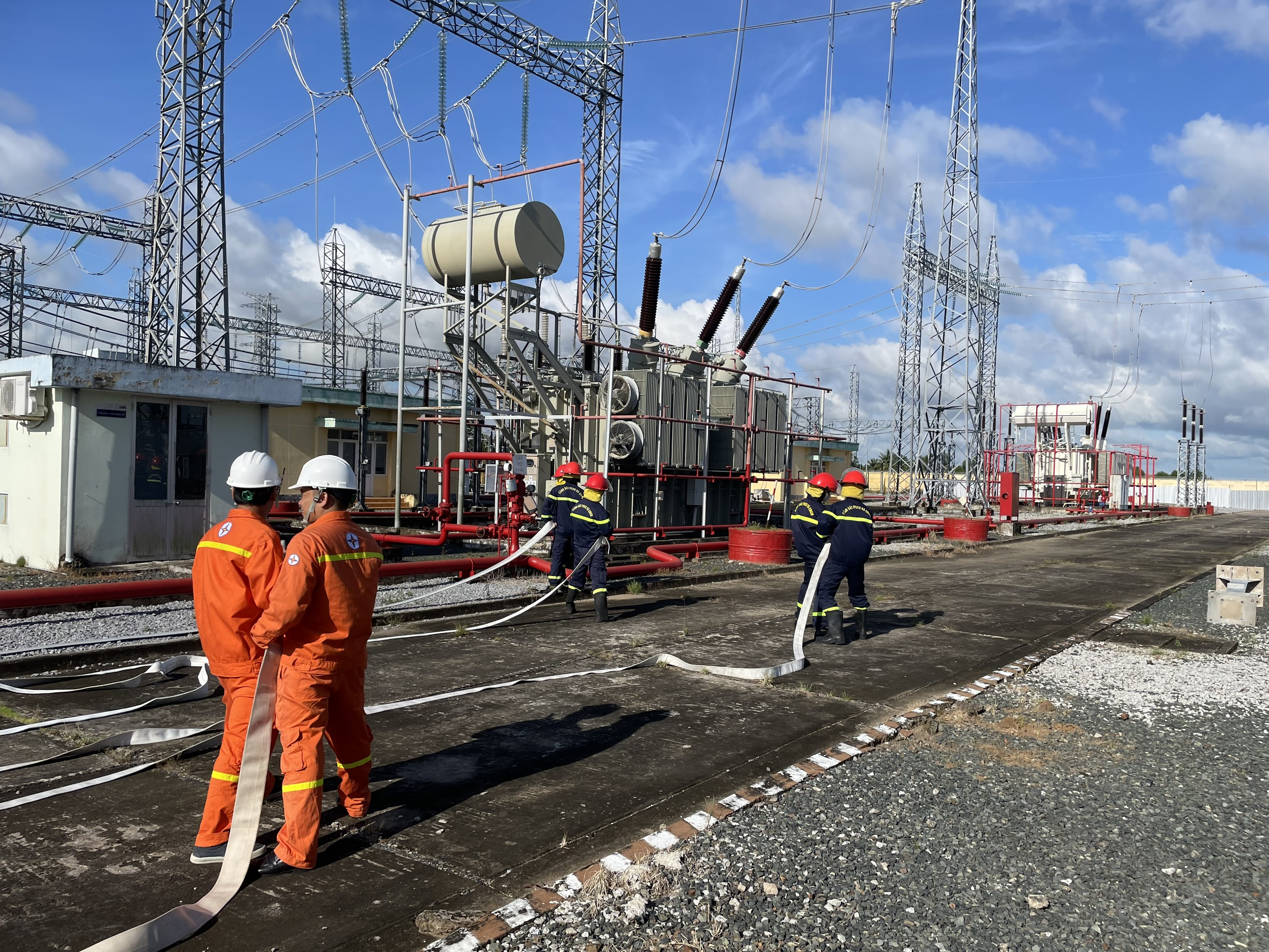 Tình huống giả định tại trạm 220kV Cà Mau lúc 08h25 ngày 27/8/2023 xảy ra cháy tại khu vực máy biến áp AT1 và có dùng trái tạo khói, phun bột Foom tại khu vục sân ngắt không mang điện. Nguyên nhân cháy do ngắn mạch bên trong các cuộn dây máy biến áp AT1 phát sinh tia lửa gây cháy. Sau khi tiếng còi báo cháy vang lên, khói bóc lên tại khu vực máy biến áp AT1 (MBA AT1) trưởng kíp đương ca phát hiện cháy MBA AT1 đã cô lập MBA AT1 và chỉ huy bảo vệ và các CBCNV ở nhà chờ ca tổng cộng có 10 người tiến hành triển khai phương án chữa cháy tại chỗ. Do máy biến áp AT1 chứa một trữ lượng dầu rất lớn nên khi xảy ra cháy ngọn lửa rất lớn và đám cháy nhanh lan ra toàn bộ khu vực MBA AT1 và có khả năng cháy rộng ra khu vực khác nên đội chữa cháy cơ sở không thể khống chế đám cháy được. Trước tình hình đó Trưởng kíp nhanh chóng gọi báo cho Phòng cảnh sát PCCC&CNCH công an tỉnh Cà Mau yêu cầu hỗ trợ chữa cháy. Sau 05 phút, lực lượng chữa cháy chuyên nghiệp phòng cảnh sát PCCC&CNCH công an tỉnh Cà Mau đã tới hỗ trợ chữa cháy gồm 01 xe chỉ huy, 02 xe chữa cháy, cùng với 20 chiến sĩ đến trạm và triển khai đội hình chữa cháy. Tại thời điểm xảy ra cháy có 01 nhân viên bị ngất xỉu do tham gia chữa cháy đã được điều hành viên tổ phối hợp cùng lực lượng PCCC & CNCH đưa ra khu vực tập kết cứu thương, sơ cấp cứu ban đầu. Sau 15 phút đám cháy đã được khống chế và dập tắt hoàn toàn.