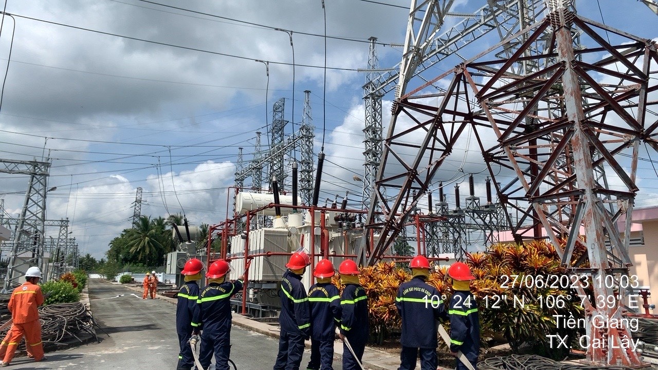 Theo tình huống giả định, vào hồi 10h00’ ngày 27/6/2023, xảy ra cháy tại máy biến thế AT1 của Trạm biến áp 220kV Cai Lậy ở địa chỉ: phường 5, thị xã Cai Lậy, tỉnh Tiền Giang. Xảy ra hỏa hoạn do nhiệt độ của máy biến thế tăng quá mức cho phép gây cháy, dầu biến áp sôi trào ra ngoài gây cháy lớn, dầu biến áp AT1 chứa một trữ lượng dầu rất lớn nên khi cháy xảy ra ngọn lửa cháy rất nhanh và cháy lan sang khu vực khác. Vào thời điểm này, các nhân viên đang làm việc sau khi xảy ra đám cháy, đám cháy phát triển nhanh và cháy lan sang máy biến thế AT2 gây cháy lớn. Do đám cháy đã phát sinh lớn và khói tỏa ra nhiều nên lực lượng PCCC cơ sở không tiếp cận được đám cháy, đồng thời nhanh chóng điện thoại cho Đội PCCC&CNCH khu vực Cai Lậy biết ngọn lửa đã bao trùm máy biến thế AT1 của Trạm biến áp 220kV Cai Lậy. Khi Cảnh sát PCCC&CNCH có mặt tại hiện trường đã phối hợp với lực lượng cơ sở tiến hành dập tắt đám cháy. Các lực lượng được phân công đã thực hiện nghiêm các nội dung theo kịch bản, các thiết bị PCCC như bình bột, bình khí, chuông còi, kẻng báo động, máy bơm nước, các ống và họng phun nước đều hoạt động bình thường và hiệu quả. Tại đây, cảnh sát đã nhanh chóng tiến hành triển khai lực lượng, triển khai lăng vòi sau khi nhận được bàn giao chỉ huy từ Đội chữa cháy cơ sở, triển khai thành nhiều hướng dập tắt đám cháy.