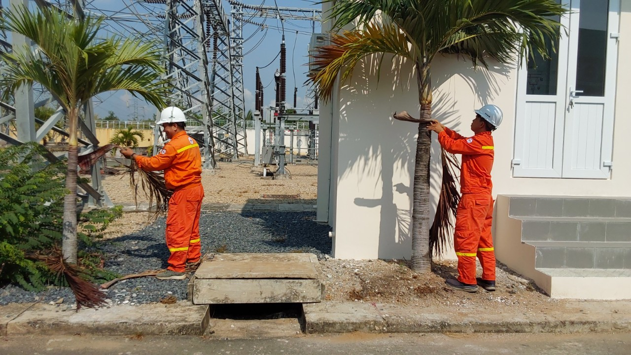 Ảnh Nhân viên vận hành trạm 220kV Nhà Bè thực hiện thu gom các vật bay nhằm ngăn ngừa sự cố do thiên tai, giông lốc