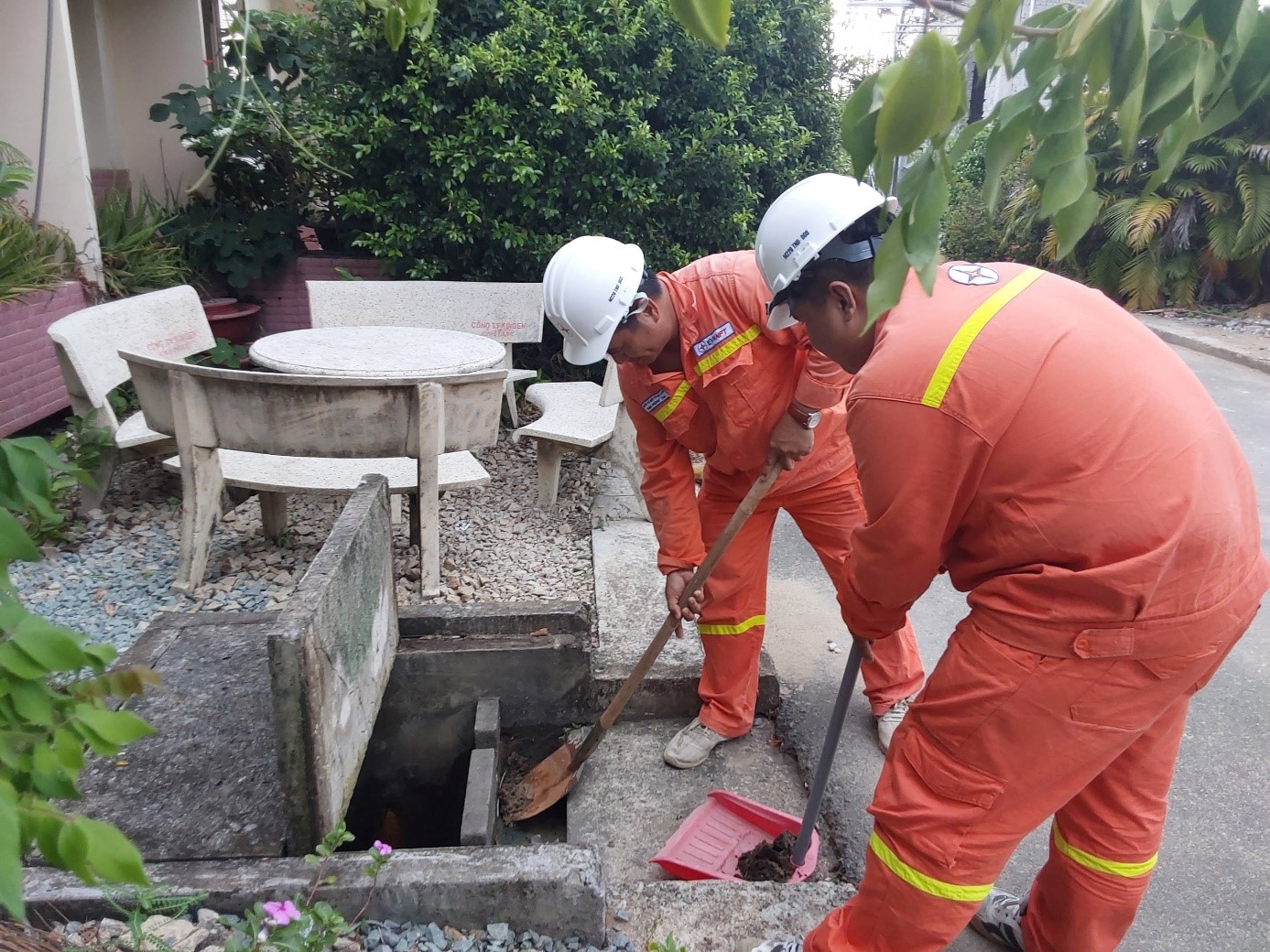 Ảnh Nhân viên vận hành trạm 220kV Nhà Bè thực hiện nạo vét các hố ga thoát nước bên trong khu vực trạm đảm bảo thoát nước tốt khi có mưa lớn