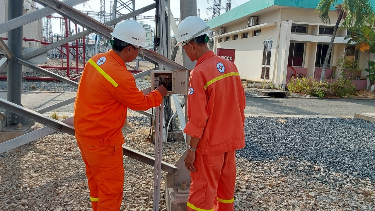 Ảnh Nhân viên vận hành trạm 220kV Nhà Bè kiểm tra và thay thế các tủ cấp nguồn hệ thống chiếu sáng ngoài sân ngắt
