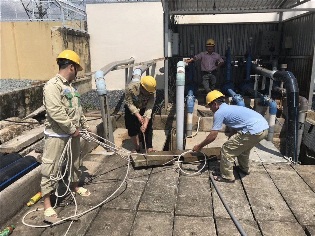 CBCNV trạm 220kV Nhà Bè đang mở nắp hố thu nước sân 220kV để thực hiện vớt rác