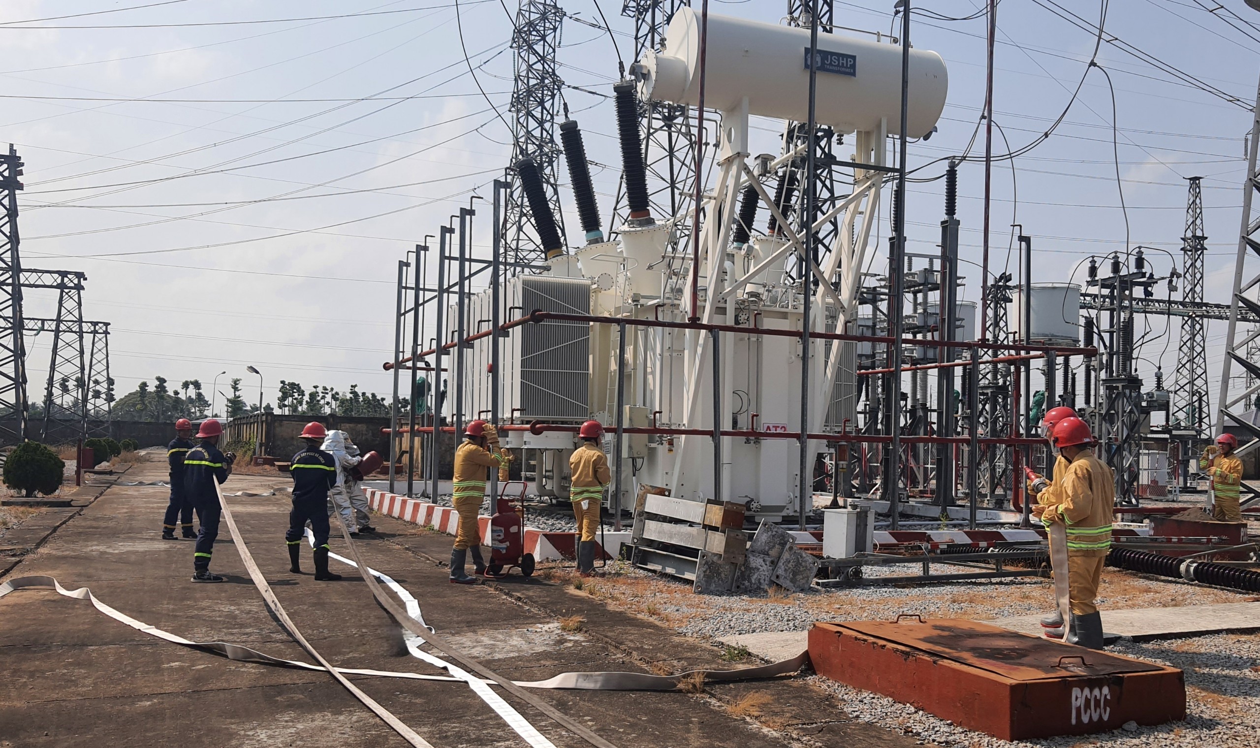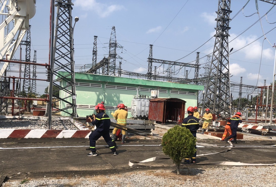 Nhân viên trạm 220kV Rạch Giá phối hợp với Đội PCCC&CNCH triển khai chữa cháy theo phương án được duyệt.