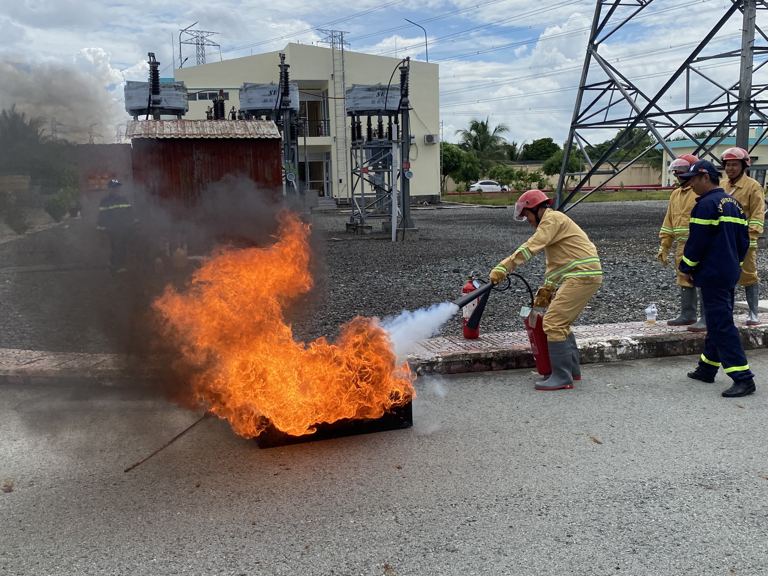Diễn tập sử dụng bình khí CO2 dập tắt đám cháy.