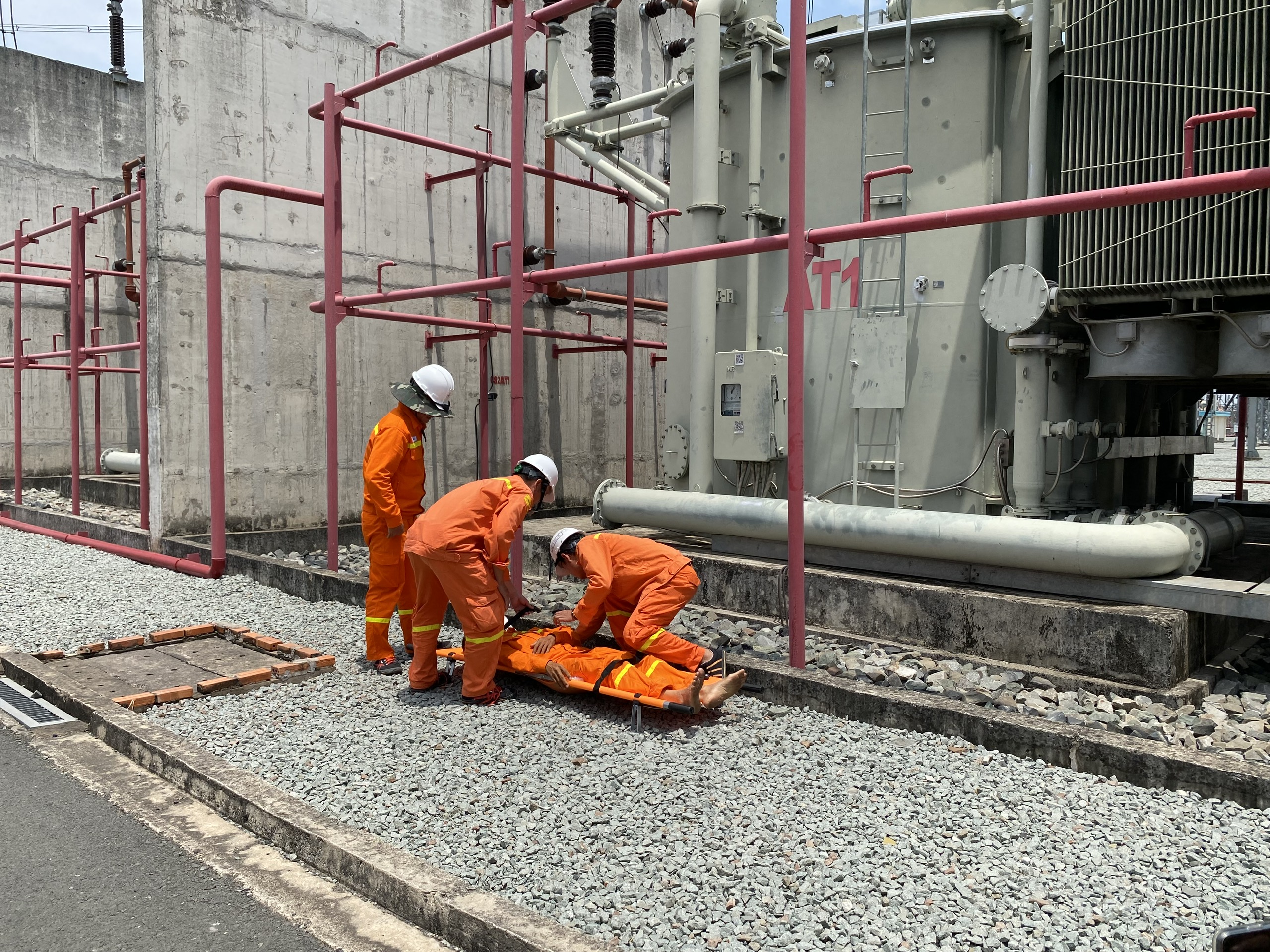 Tình huống giả định là một vụ cháy xảy ra tại khu vực máy biến áp AT1, nguyên nhân do hư hỏng máy biến áp gây nổ, làm dầu từ máy biến áp trào ra ngoài và gây cháy lớn. Đám cháy lan rộng với diện tích khoảng 120m² tại khu vực pha B của máy biến áp AT1. Phát hiện cháy, lực lượng tại chỗ khẩn trương tiến hành công tác cứu nạn, di chuyển nạn nhân ra khỏi nơi nguy hiểm, đồng thời liên hệ báo cho lực lượng Cảnh sát PCCC và CHCN - Công an tỉnh Bình Dương đến hỗ trợ. Giả định ngay khi nhận được tin báo, Phòng Cảnh sát PCCC&CNCH - Công an tỉnh Bình Dương đã điều động 01 xe chuyên dụng, 02 xe chữa cháy, 01 xe cứu nạn, cứu hộ cùng 15 cán bộ chiến sỹ đến ngay hiện trường phối hợp với lực lượng chữa cháy cơ sở nhanh chóng dập tắt đám cháy.