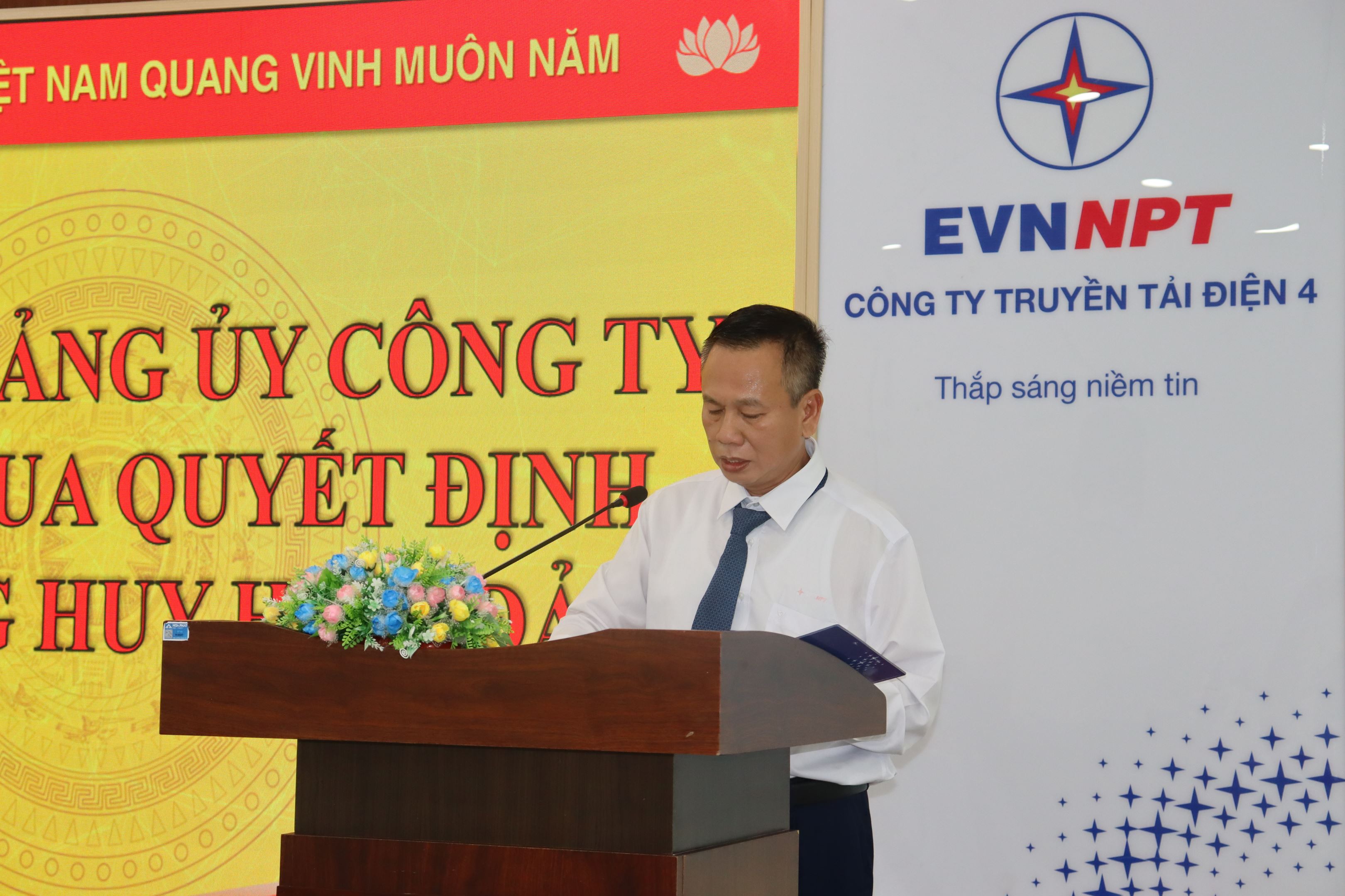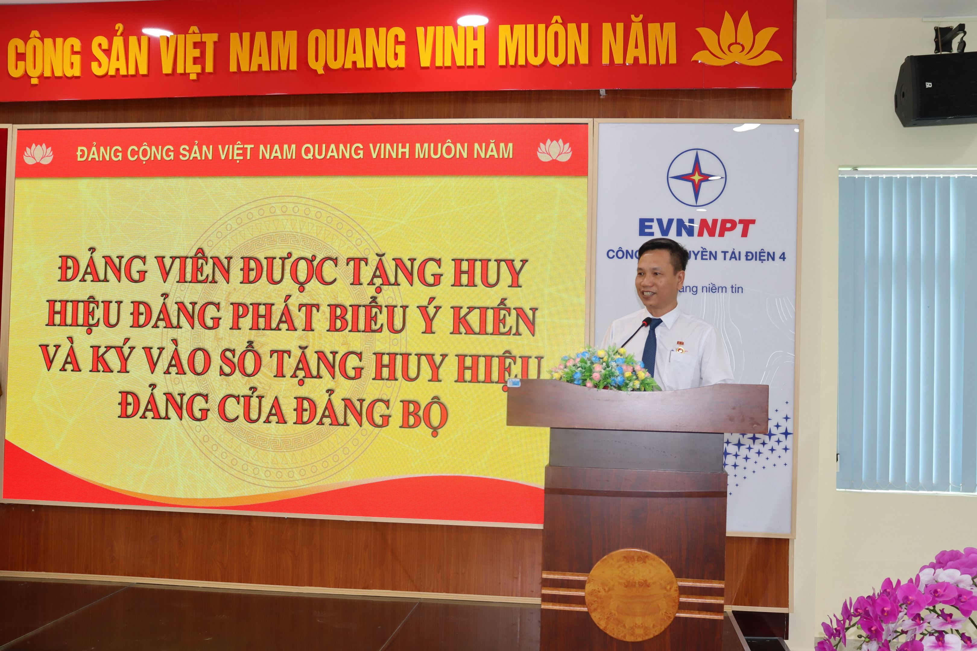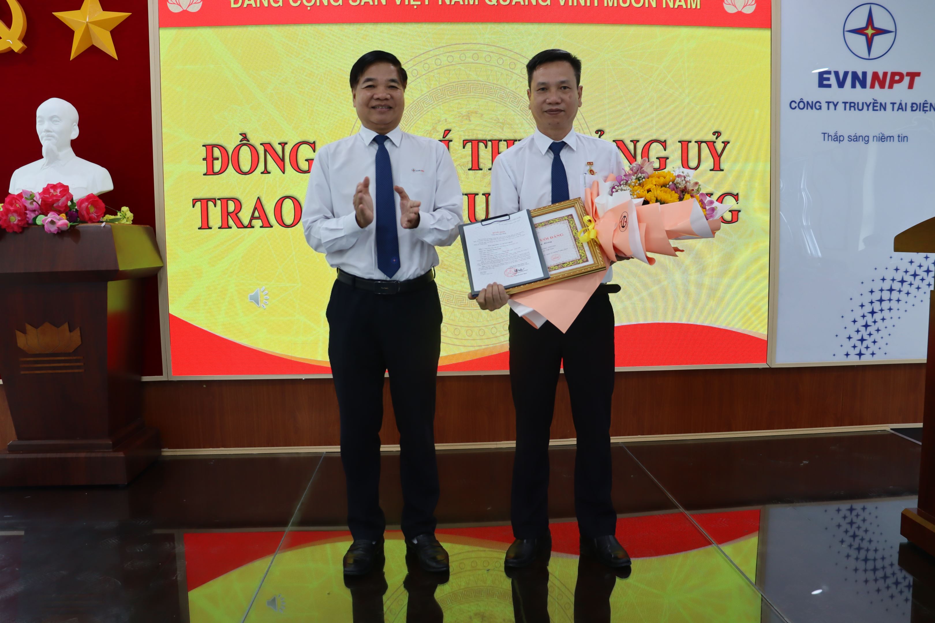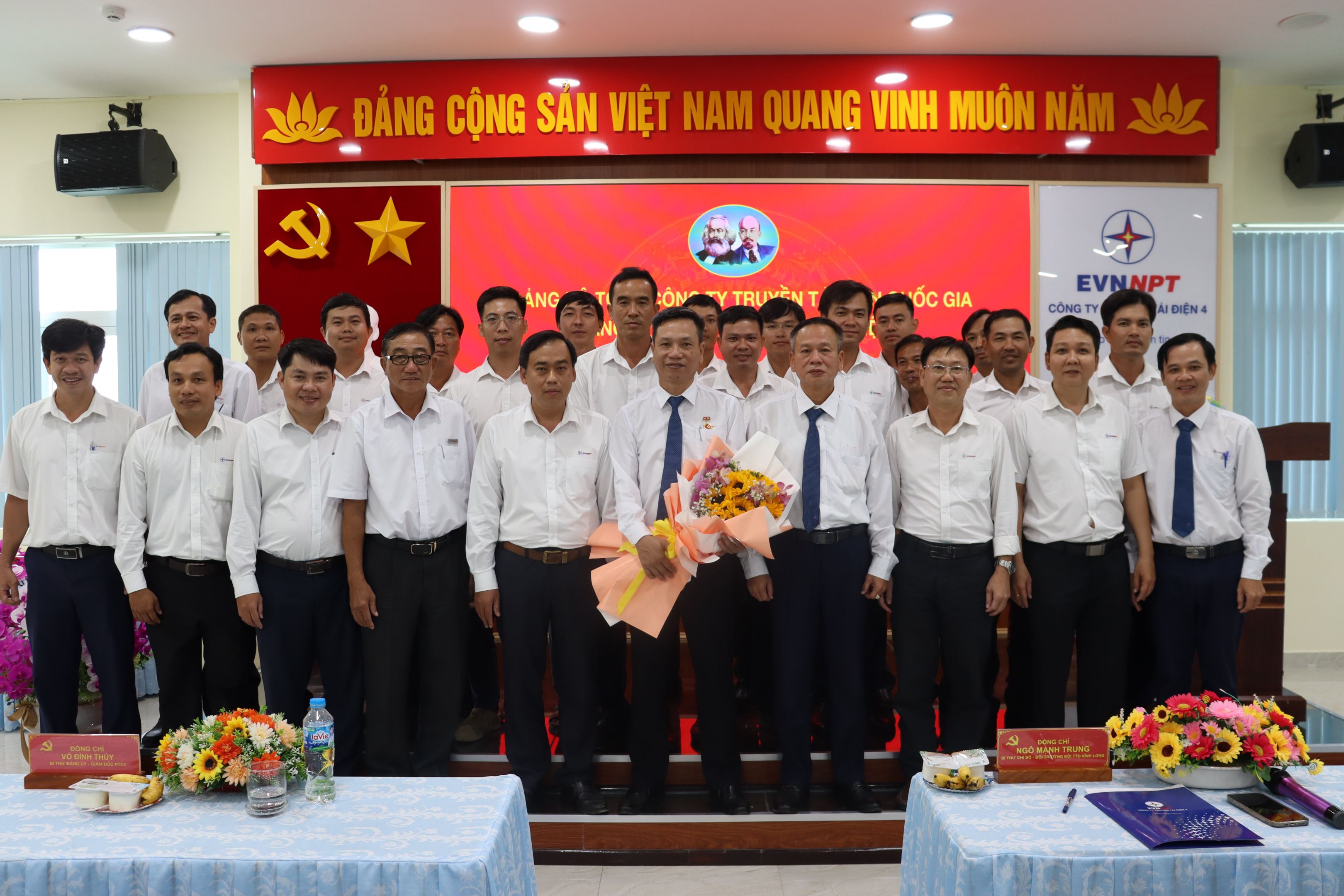 Đồng chí Võ Đình Thủy – Bí thư Đảng ủy, Giám đốc Công ty Truyền tải điện 4 trao Huy hiệu 30 năm tuổi Đảng và tặng hoa chúc mừng đồng chí Nguyễn Phụng Long thuộc Chi bộ Đội Truyền tải điện Vĩnh Long