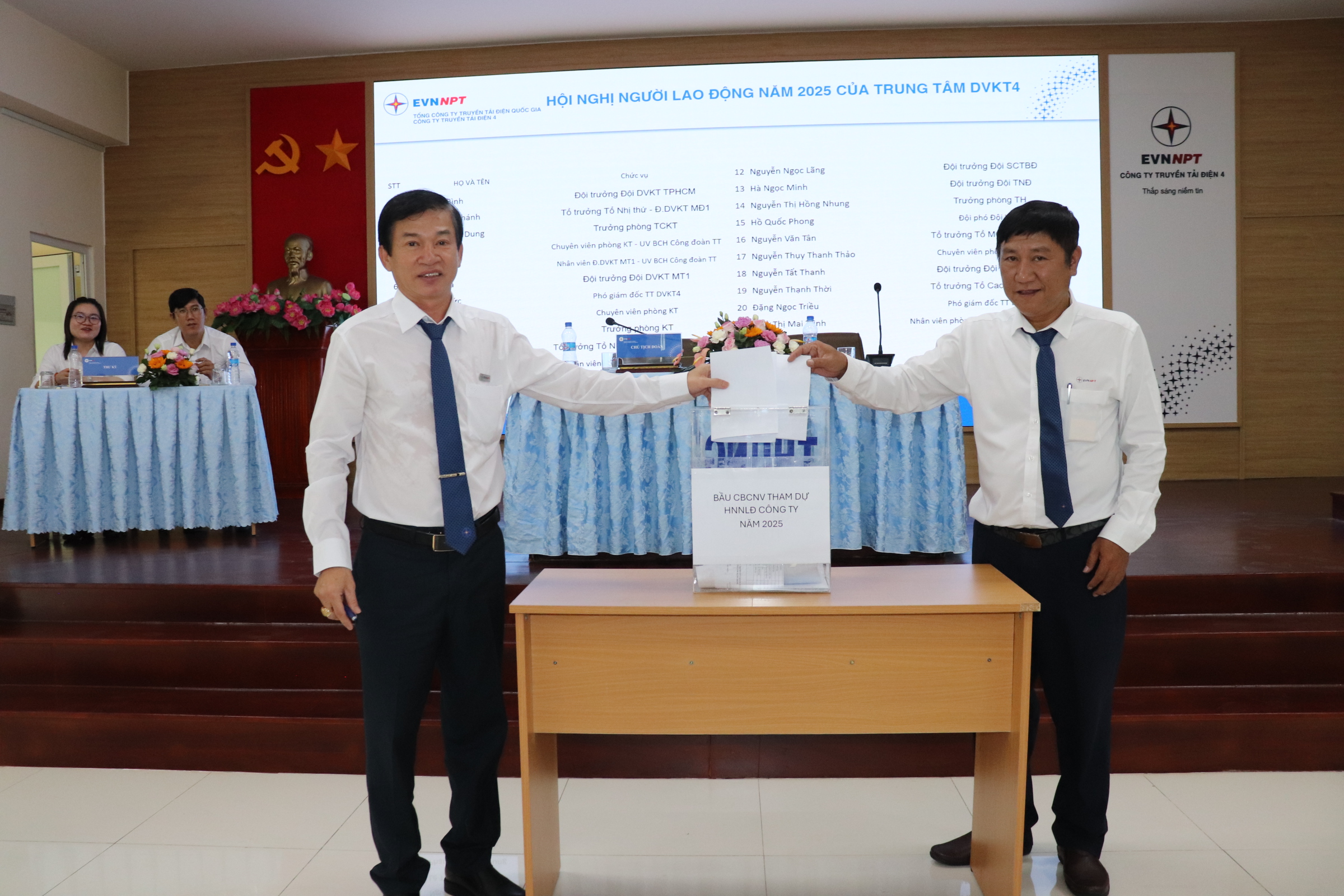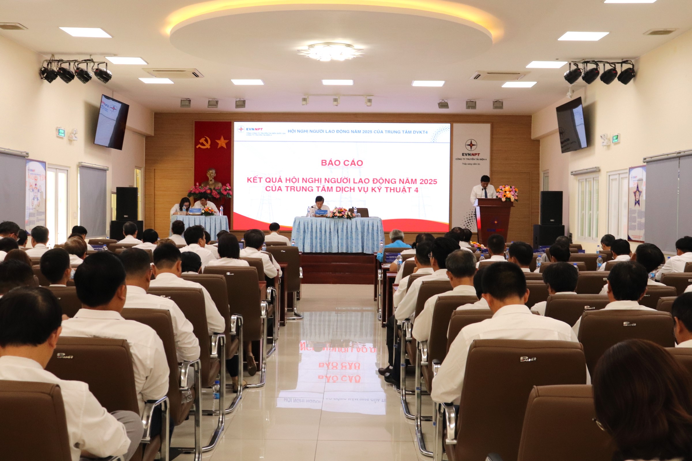 Đến dự và chỉ đạo Hội nghị có Ông Nguyễn Phương Nam, Chủ tịch Công đoàn Công ty và 120 đại biểu đại diện cho 215 CBCNV Trung tâm DVKT4 cùng tham dự. Hội nghi được điều hành bởi Chủ tịch đoàn, gồm đồng chí Nguyễn Duy Trung – Giám đốc Trung tâm và đồng chí Hà Quang Đức – Chủ tịch Công đoàn – Phó Giám đốc Trung tâm.