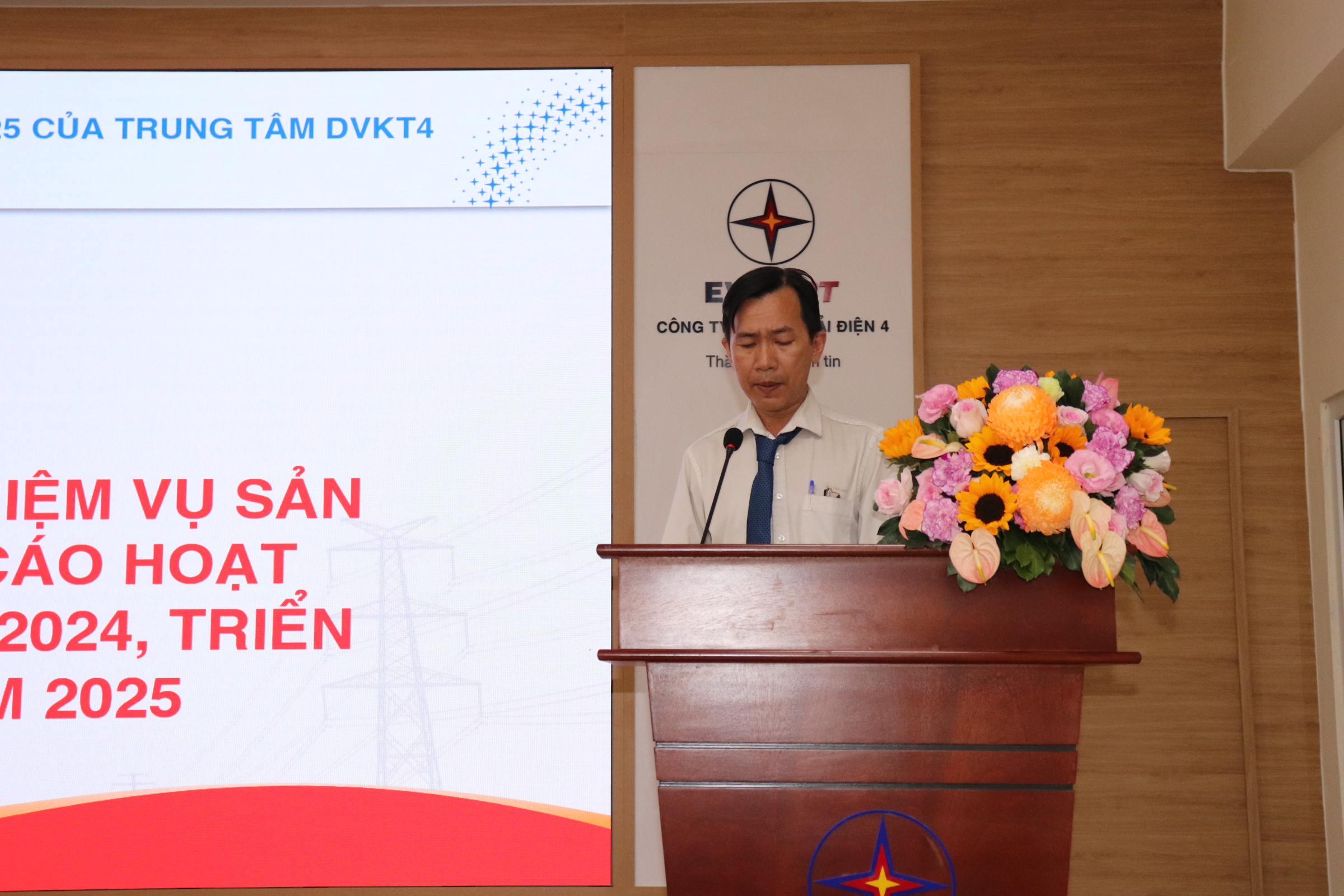 Ông Huỳnh Thu Song Khánh – Phó Chủ tịch Công đoàn Trung tâm trình bày báo cáo tình hình hoạt động sản xuất kinh doanh năm 2024, Báo cáo kết quả hoạt động Công đoàn năm 2024 và phương hướng nhiệm vụ năm 2025. Theo đó năm 2024, Trung tâm DVKT4 đã hoàn thành tốt nhiệm vụ, phối hợp tốt với sản xuất vận động CNVCLĐ thực hiện tốt các chỉ tiêu kinh tế kỹ thuật. Chỉ đạo tổ công đoàn cấp dưới tổ chức, phát động và thực hiện tốt các phong trào thi đua. Thực hiện kịp thời, chu đáo, động viên, chăm lo quyền lợi hợp pháp chính đáng cho người lao động. Công đoàn đã phối hợp với Chính quyền, Đoàn thanh niên tổ chức chăm lo bảo vệ các quyền lợi hợp pháp, chính đáng cho người lao động: thông qua các hoạt động an sinh xã hội, thăm hỏi, động viên, trợ cấp cho người lao động. BCH Công đoàn thăm hỏi, tặng quà động viên tinh thần các nhóm công tác thi công các công trình trọng điểm, các công trình thực hiện trong điều kiện thời tiết khắc nghiệt, áp lực lớn, nhất là trong các dịp nghỉ tết Nguyên đán, nghỉ lễ 30/4 và 1/5, Giỗ Tổ Hùng Vương. Tham gia các hội thao giữa các đơn vị trong Công ty Truyền tải điện 4 nhằm tạo mối đoàn kết, gắn bó , học hỏi lẫn nhau, cùng nhau hoàn thành tốt mọi nhiệm vụ…