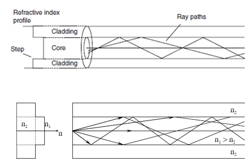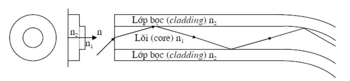 Sợi quang này có chiết suất của lõi và vỏ bọc chênh lệch như hình bậc thang. Các tia sáng vào đầu sợi với góc tới khác nhau sẽ truyền theo các đường khác nhau. Hình 2.6 mô tả quá trình truyền ánh sáng trong sợi quang có chiết suất nhảy bậc (SI).