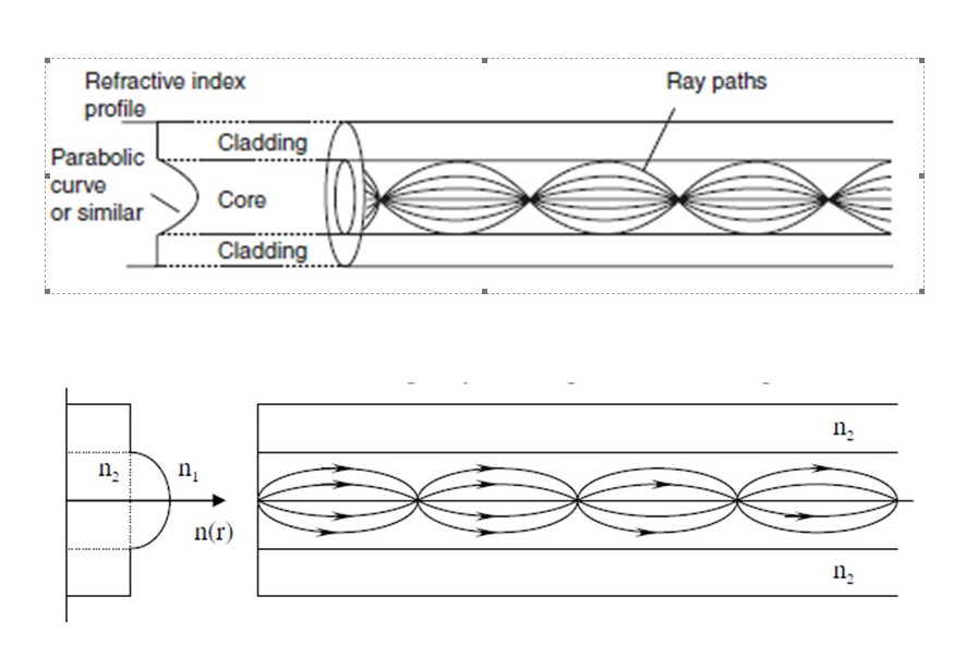 Đường truyền của các tia sáng trong sợi quang này cũng không bằng nhau nhưng vận tốc truyền cũng thay đổi. Các tia truyền xa trục có đường truyền dài hơn nhưng vận tốc truyền cũng lớn hơn và ngược lại. Tia truyền dọc trục có đường truyền ngắn nhất vì chiết suất ở trục là lớn nhất. Thời gian của các tia truyền này sẽ bằng nhau nếu chiết suất được phân bố theo đường parabol và khi đó các tia sáng có dạng hình sin. Sợi quang này có độ tán sắc nhỏ hơn rất nhiều so với sợi quang có chiết suất nhảy bậc.