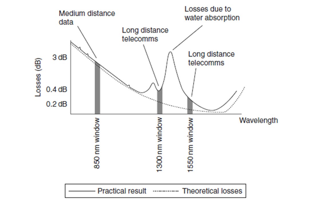 Ánh sáng dùng trong thông tin quang nằm ở vùng cận hồng ngoại với bước sóng từ 800 nm đến 1600 nm. Đặc biệt, có 3 bước sóng thông dụng là 850 nm, 1300 nm, và 1550 nm. Hình 2.2 mô tả đặc tính truyền dữ liệu có tính đến khoảng cách và suy hao trên 03 cửa sổ bước sóng thông dụng này.