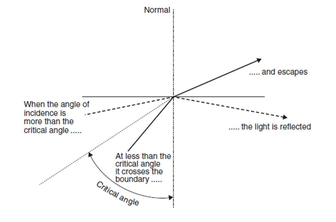 Theo định lý Snell, khi điều chỉnh tia sáng đến môi trường 1 sao cho góc phản xạ α tăng thì góc khúc xạ β cũng tăng theo. Khi góc khúc xạ β = 900 thì góc phản xạ α lúc này được gọi là góc tới hạn αT . Nếu tiếp tục tăng góc α > αT thì lúc này không còn tia khúc xạ mà chỉ còn tia phản xạ. Hiện tường này gọi là hiện tượng phản xạ toàn phần. Hình 2.3 minh họa thêm về hiện tượng này.