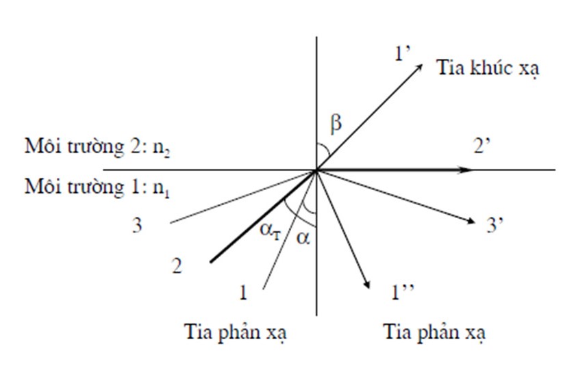 Khi tia sáng truyền trong môi trường 1 đến mặt tiếp giáp môi trường 2 thì tia sáng tách thành 02 tia mới: 01 tia phản xạ lại môi trường 1 và 01 tia khúc xạ sang môi trường 2.