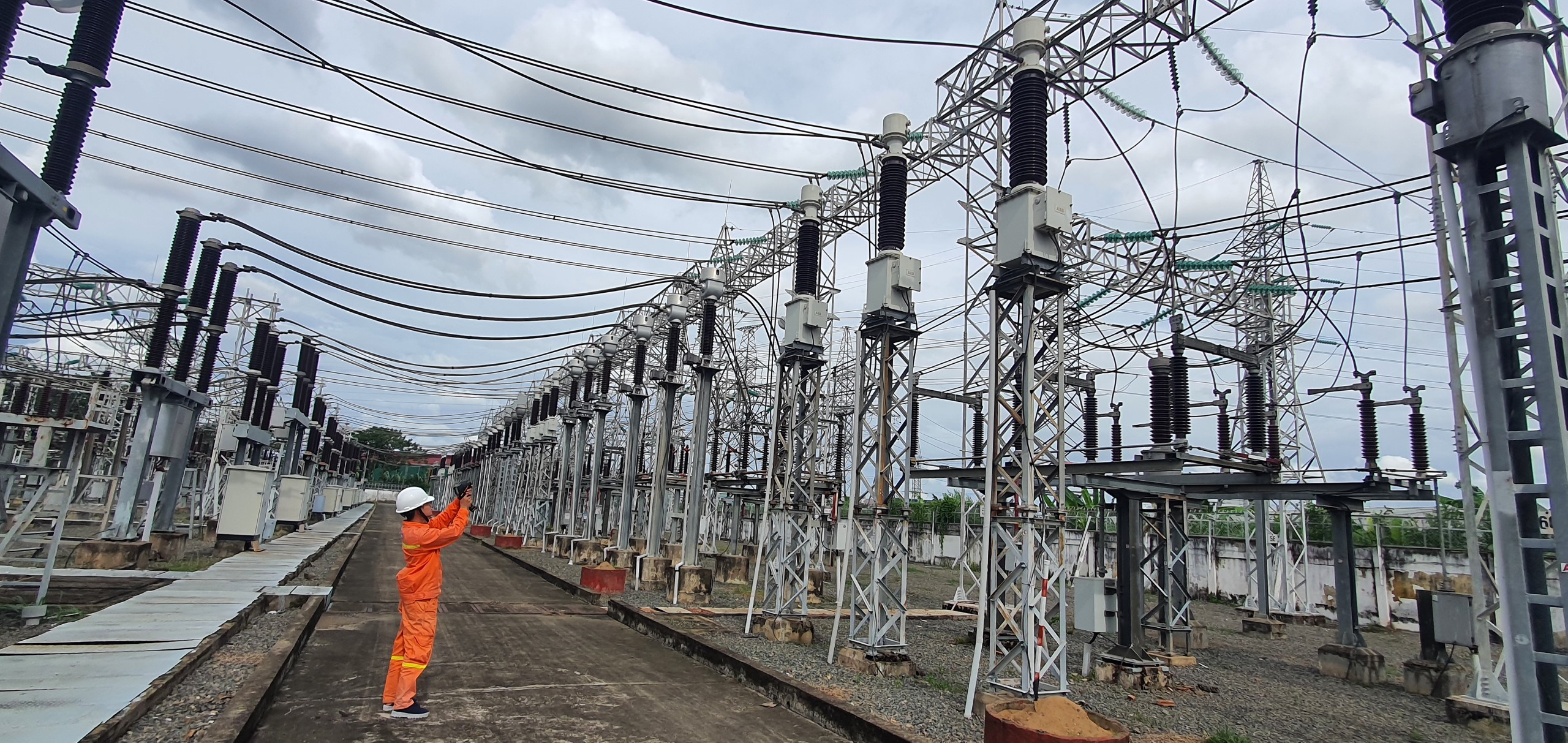 Nhân viên vận hành TBA đang kiểm tra thân nhiệt TI tại trạm 220kV Long Bình.