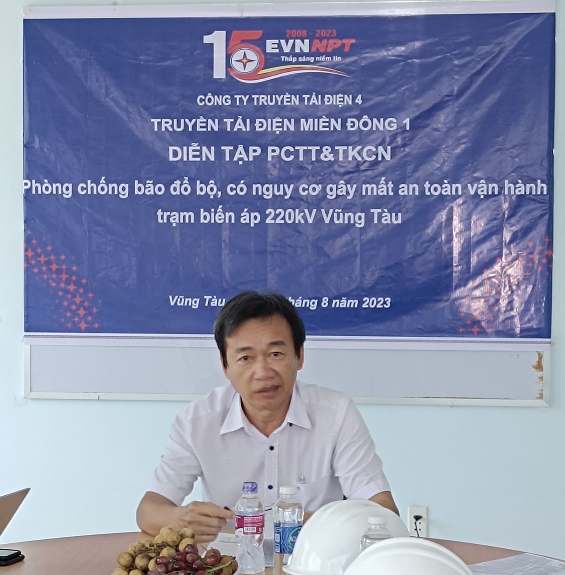 Ông Võ Xuân Cường - Tổ trưởng tổ TTLĐ Mỹ Xuân - đang trình bày về phương án phòng chống thiên tai, ứng phó bão lũ tại trạm 220kV Vũng Tàu.