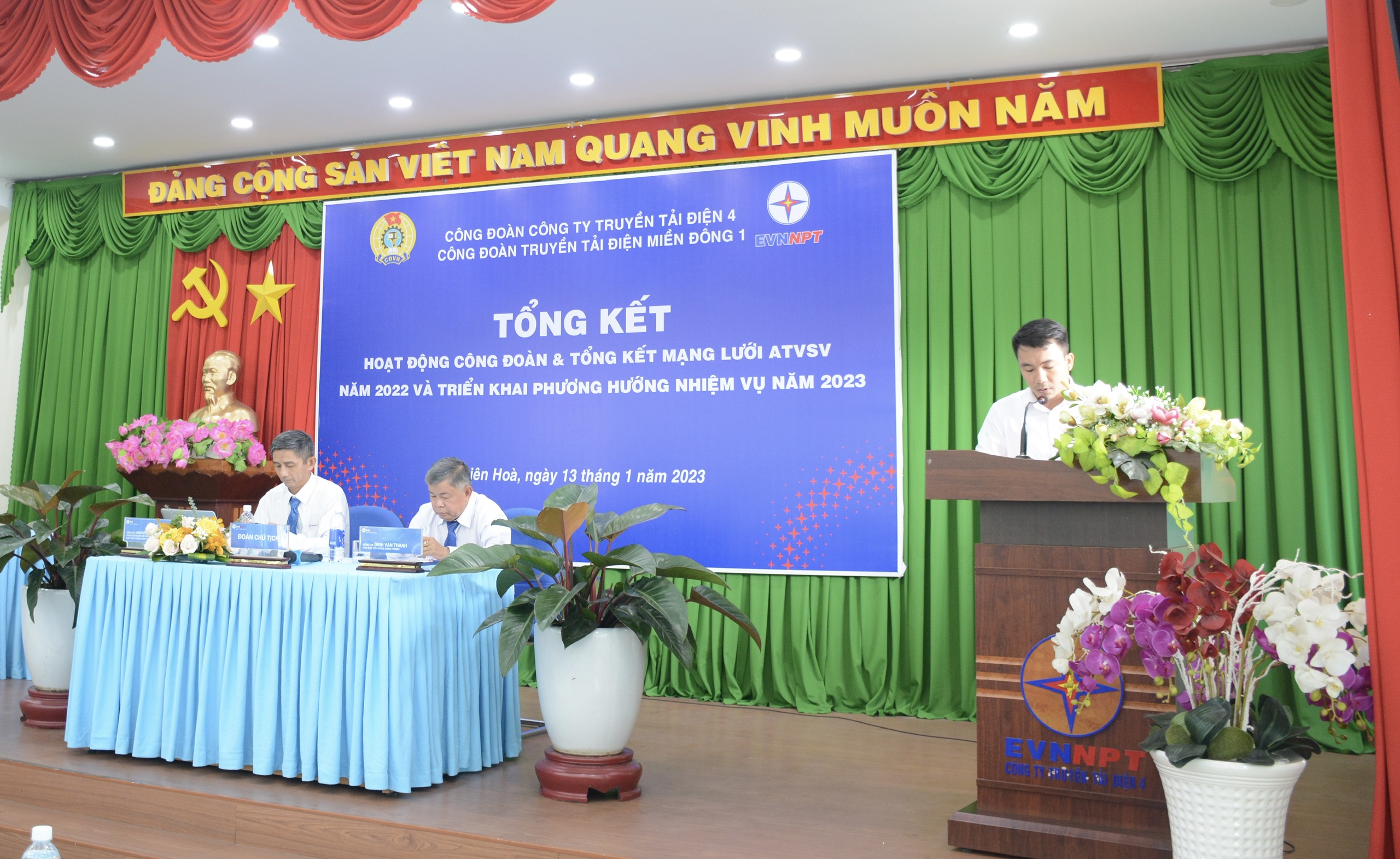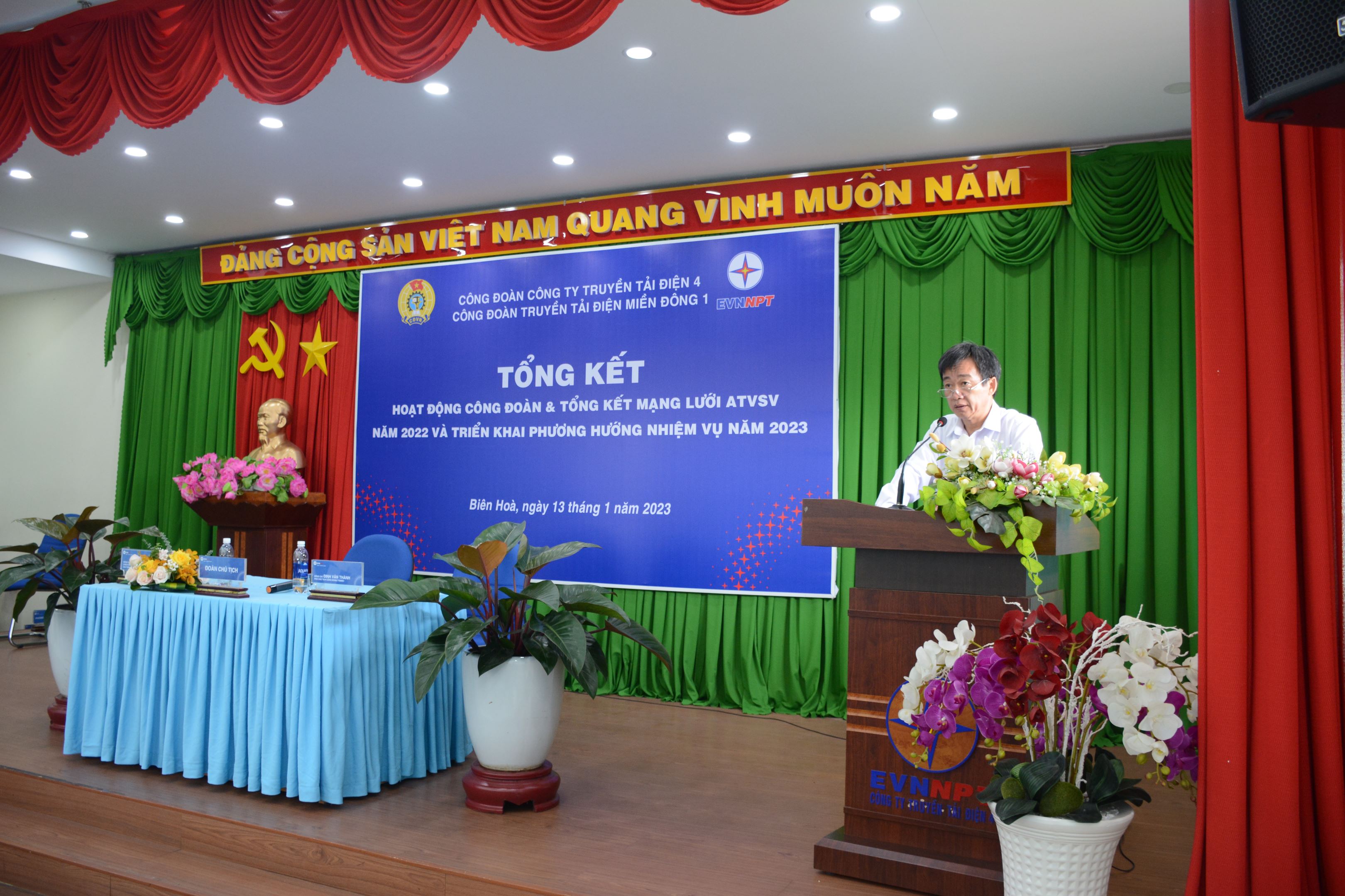 Đ/c Nguyễn Minh Dũng - Bí thư Đảng ủy bộ phận, Giám đốc Truyền tải điện miền Đông 1 đã phát biểu ghi nhận và đánh giá cao thành tích hoạt động năm 2022 của Công đoàn và toàn thể đoàn viên công đoàn TTĐMĐ1. Bên cạnh đó Đ/c Giám đốc cũng nêu ra những ý kiến chỉ đạo sâu sát, tập trung vào các nội dung trọng tâm như; tiếp tục phối hợp với chuyên môn đẩy mạnh các hoạt động, xây dựng mối quan hệ lao động hài hòa, ổn định để góp phần hoàn thành thắng lợi nhiệm vụ chính trị của cấp trên giao phó; đồng chí nhấn mạnh; bên cạnh việc lưu ý đến hoạt động của mạng lưới an toàn vệ sinh viên Công đoàn phải quán triệt đến Đoàn viên công đoàn trong việc thực hành tiết kiệm, chống lãng phí theo chủ đề năm 2023.