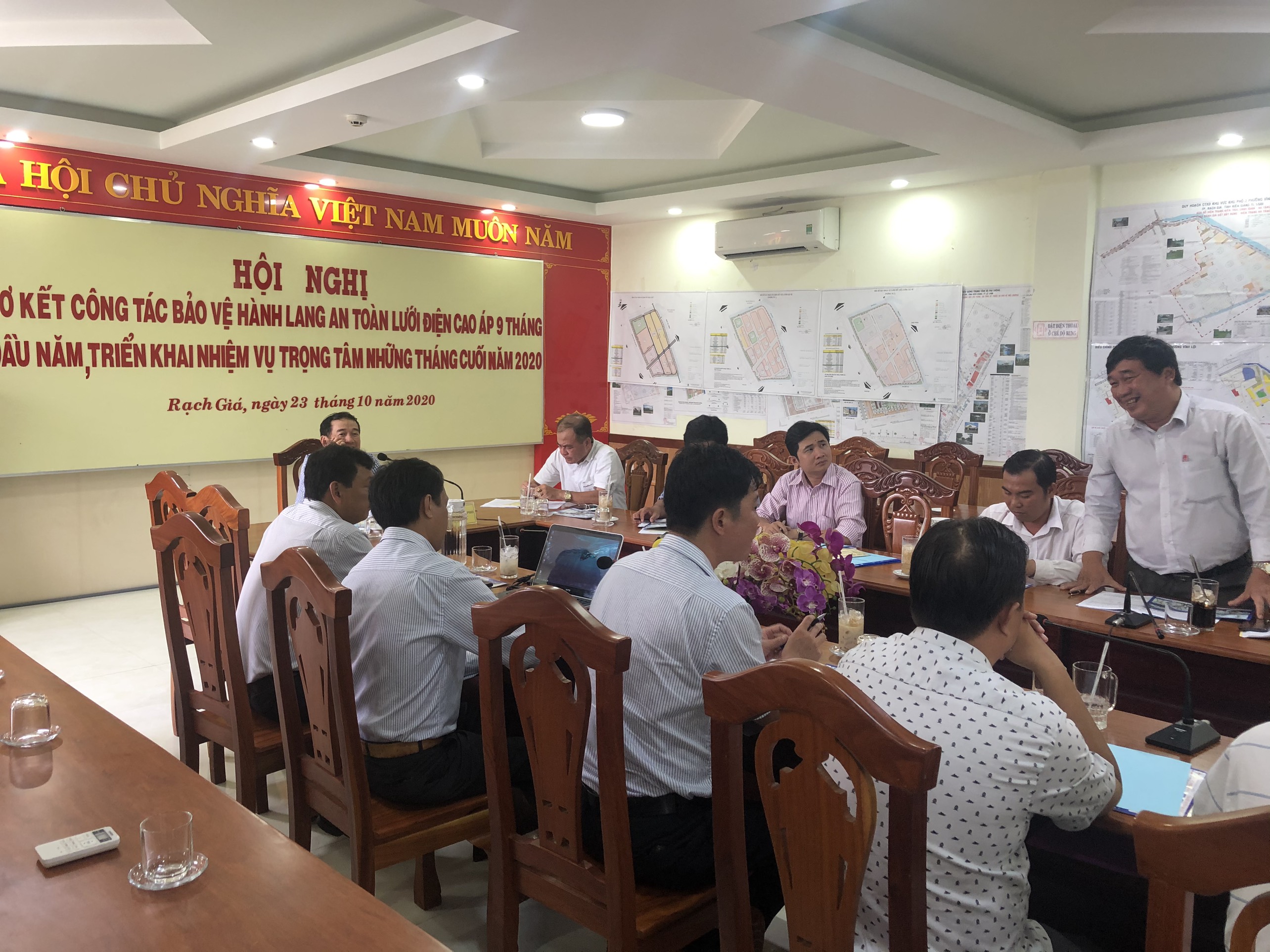 Tại Hội nghị, đ/c Đào Văn Chương trình bày báo cáo tổng kết công tác bảo vệ hành lang an toàn lưới điện Truyền tải năm 2019 và 09 tháng đầu năm 2020 trên địa bàn TP. Rạch Giá, nhấn mạnh về tầm quan trọng của tuyến đường dây 220 kV Rạch Giá – Kiên Bình là đường dây huyết mạch cung cấp điện cho trạm 220kV Kiên Bình với tổng số 17 trụ điện trải dài trên địa bàn 03 phường thuộc TP. Rạch Giá cung cấp điện cho toàn bộ các phụ tải khu vực huyện Hòn Đất, Kiên Lương, Giang Thành, TP Hà Tiên, huyện đảo Phú Quốc, kết nối lưới điện với khu vực Châu Đốc An Giang để cung cấp điện cho nước bạn Campuchia.