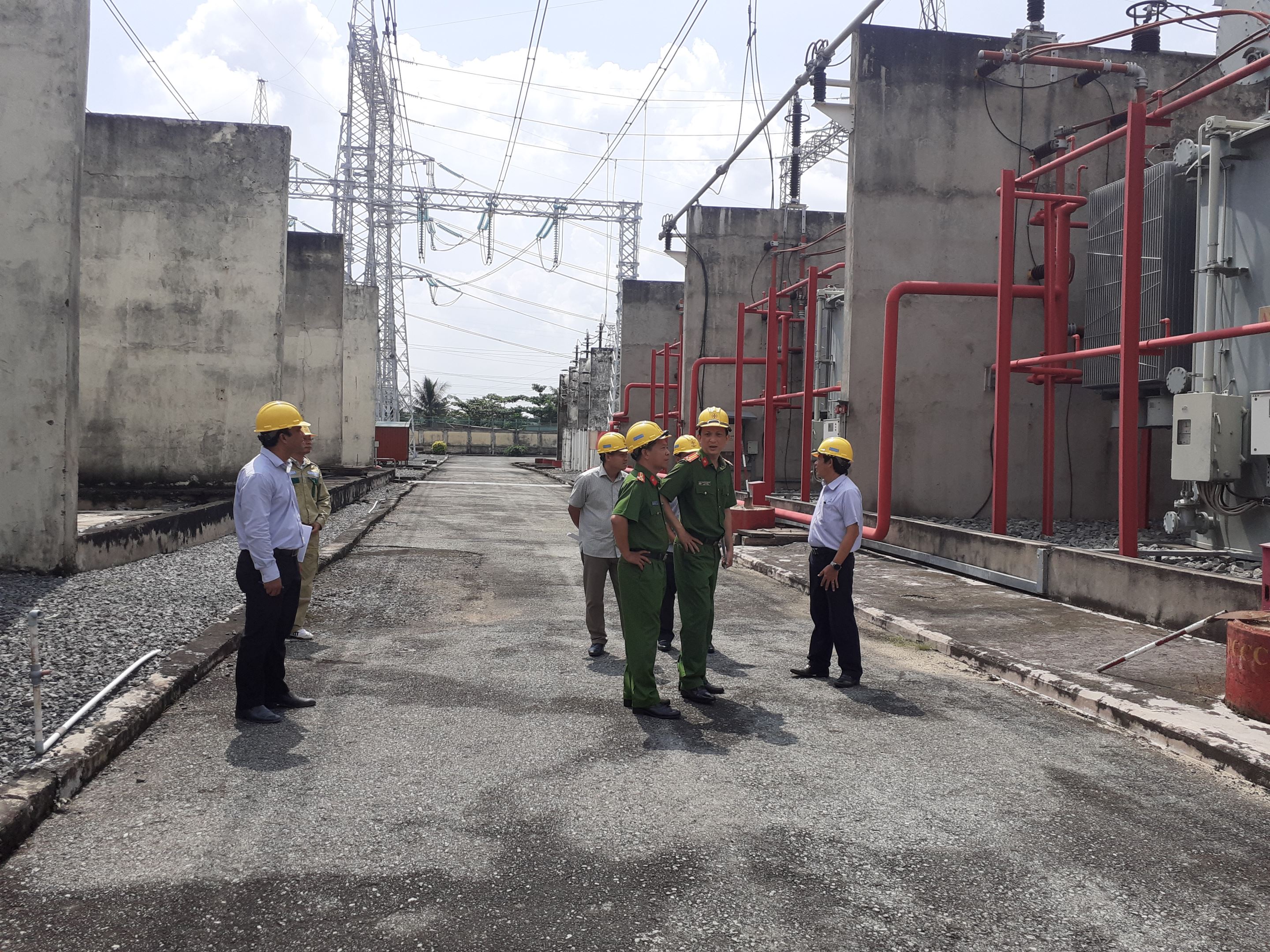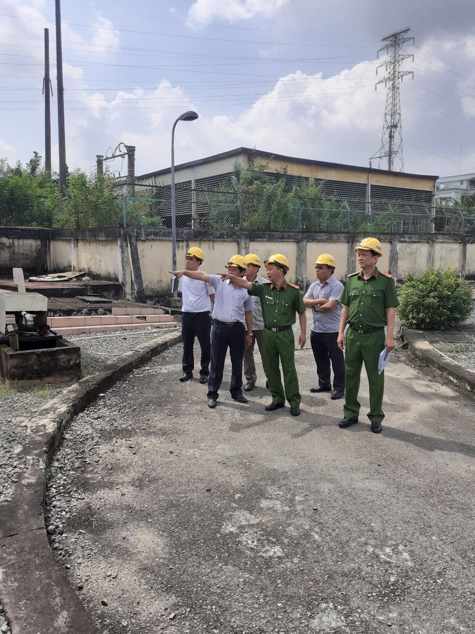 Thượng tá Lê Đức Thuận cùng đoàn công tác khảo sát tường rào trạm 500kV Phú Lâm.