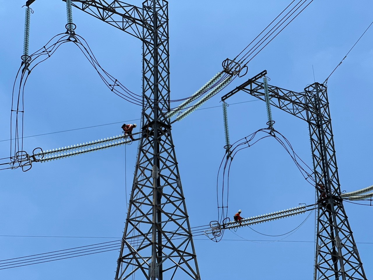 Ảnh: Nhân viên quản lý vận hành đường dây Đội TTĐ Phú Lâm đang thực hiện vệ sinh sứ tại tuyến đường dây 500kV Phú Lâm – Cầu Bông