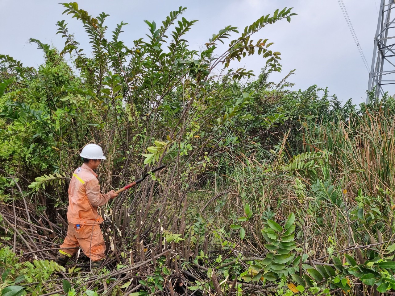 Ảnh: Nhân viên quản lý vận hành đường dây Đội TTĐ Nhà Bè thực hiện phát quang dưới hành lang đường dây 500kV Mỹ Tho – Nhà Bè