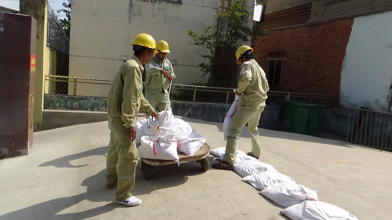 Tập thể CBCNV đội truyền tải điện Nhà Bè xúc cát vào bao để sử dụng ngăn nước tràn từ đường Phạm Hữu Lầu vào cổng trạm 500kV Nhà Bè