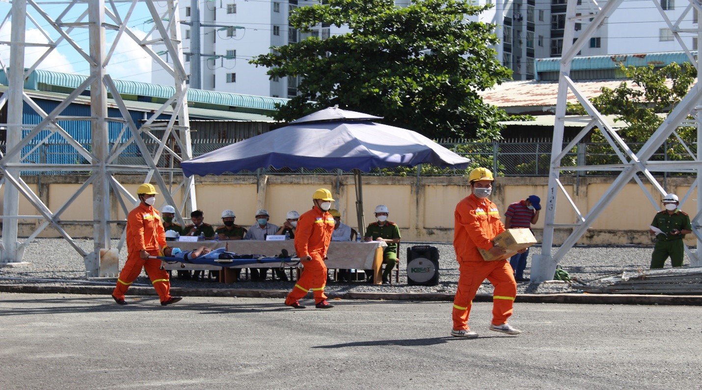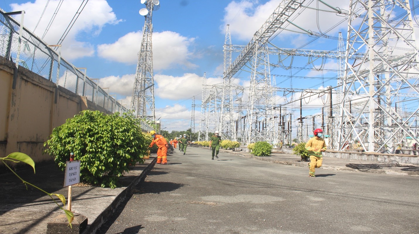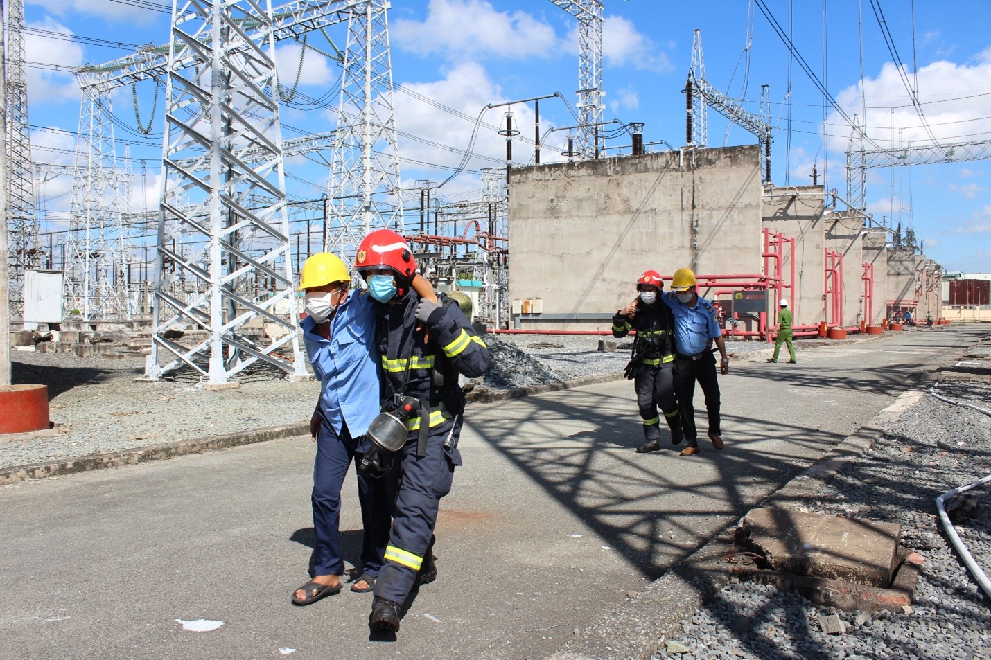 Tình huống giả định xảy ra cháy tại khu vực Trạm 500KV. Thời điểm này vẫn còn nhiều nạn nhân kẹt trong đám cháy, chưa thể thoát ra ngoài. Ngay sau khi nhận tin báo, lực lượng Cảnh sát PCCC&CNCH có mặt tại hiện trường phối hợp với lực lượng cơ sở cứu người và dập tắt hoả hoạn.