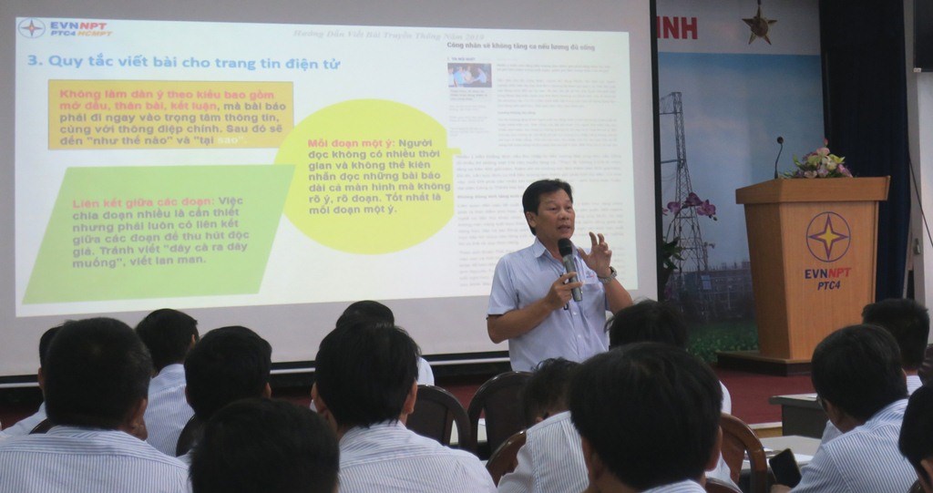 Trong công tác viết tin, bài của CBCNV thuộc TTĐHCM, ông Hoàng đánh giá có nhiều tiến bộ so với thời gian trước đây. Tuy nhiên, hiện nay việc viết tin, bài chỉ tập trung trong một số ít CBCNV và nội dung bài viết chưa chuyên sâu; số lượng bài viết về công tác kỹ thuật, về thực thi Văn hóa EVNNPT chưa nhiều…... Tại phần trình bày nội dung này, ông Hoàng đã dành thời gian cho các học viên nêu lên các khó khăn, vướng mắc trong việc viết tin, bài; cũng như đóng góp các ý kiến, giải pháp nhằm nâng cao số lượng CBCNV viết tin, bài, đa dạng hóa, chuyên sâu về nội dung bài viết về các hoạt động trong đơn vị. Ngoài ra, ông Hoàng còn hướng dẫn thêm cho các CBCNV tham gia lớp học về kỹ năng viết tin, bài, chụp ảnh về các hoạt động nội bộ và hoạt động bên ngoài nhằm đưa tin phục vụ công tác tuyên truyền.