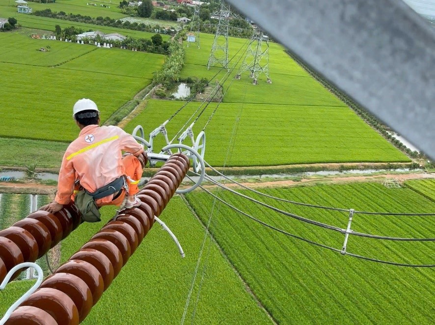 Công nhân đường dây Đội TTĐ Bình Chánh thực hiện tăng cường lèo dây dẫn hạn chế phát sinh nhiệt khi vận hành trên đường dây 500kV Phú Lâm - Mỹ Tho.