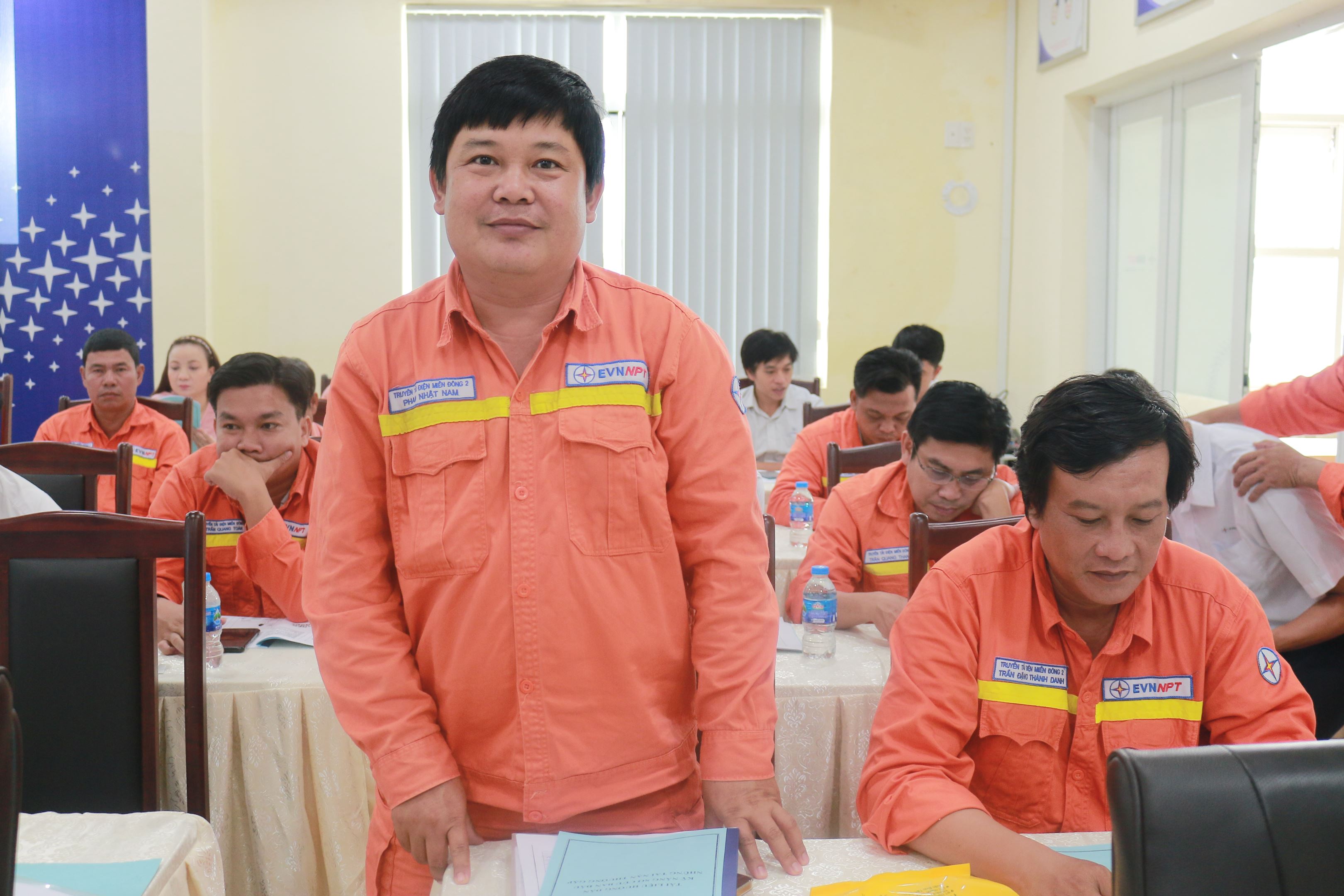 Anh Phan Nhật Nam - CNKT Đội Truyền tải điện Tây Ninh trao đổi với giảng viên tại lớp học.
