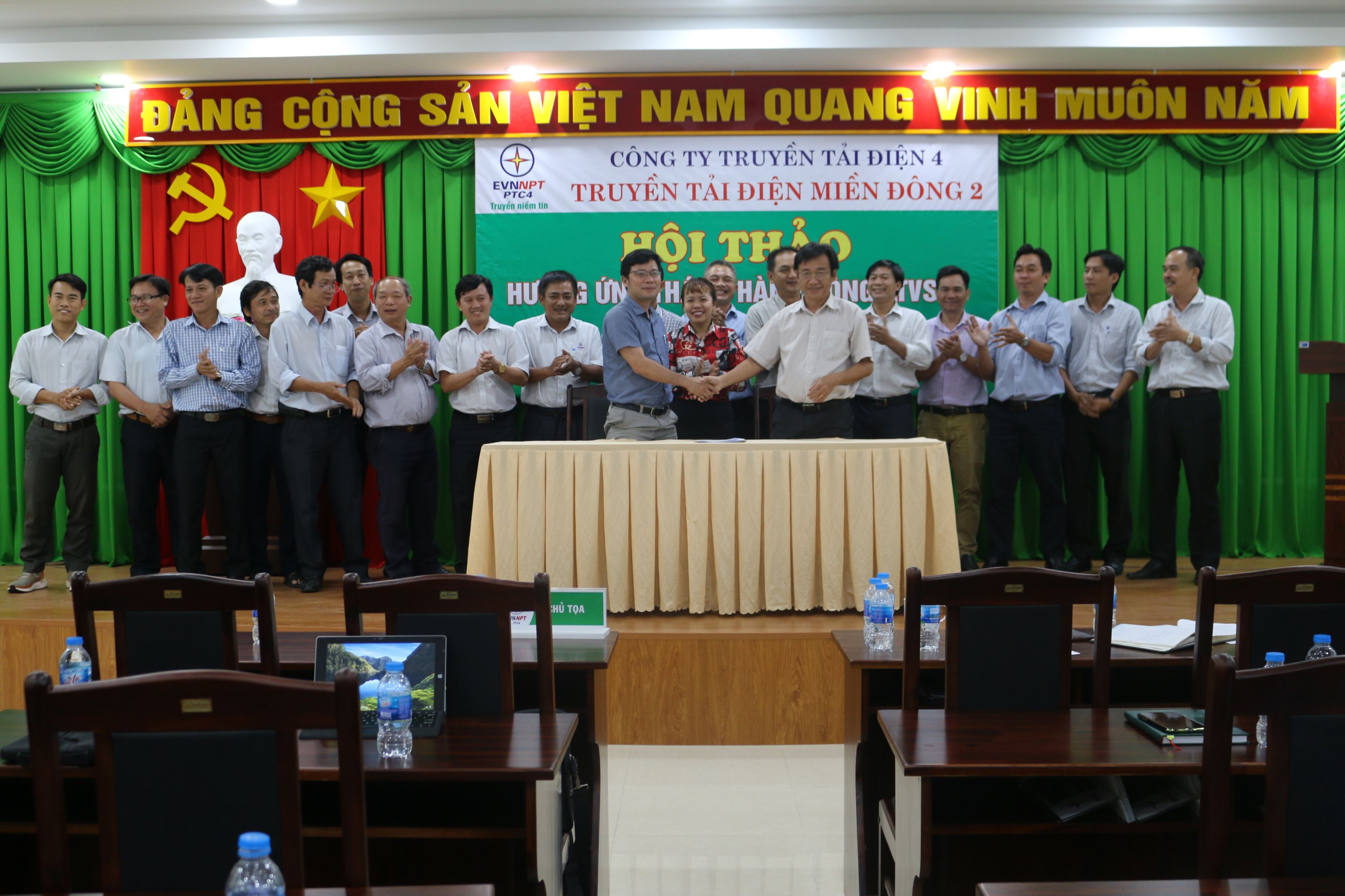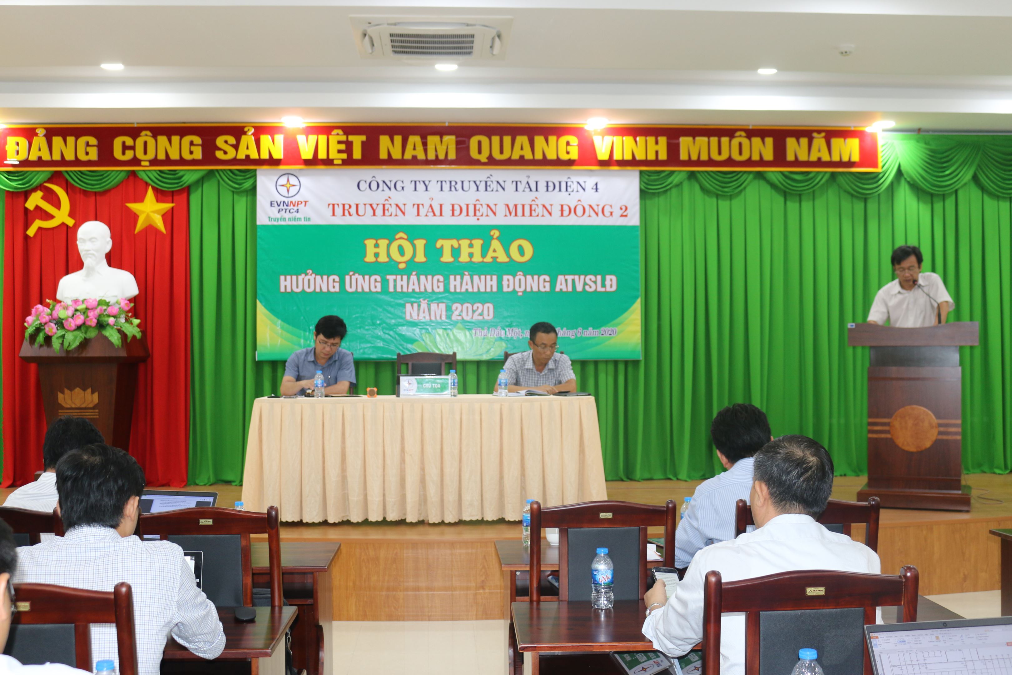 Hưởng ứng tháng hành động hành động về an toàn, vệ sinh lao động năm 2020, bắt đầu từ ngày 01/05/2020 đến ngày 31/05/2020 với chủ đề: “Đẩy mạnh cải thiện điều kiện lao động và kiểm soát các nguy cơ rủi ro về an toàn, vệ sinh lao động tại nơi làm việc”. Ngày 04/06/2020 tại hội trường Truyền tải, Truyền Tải Điện Miền Đông 2 (TTĐMĐ2) đã tổ chức Hội thảo hành động về an toàn, vệ sinh lao động năm 2020 dưới sự chủ trì của Ông Nguyễn Minh Dũng_Giám đốc TTĐMĐ2-Trưởng ban chỉ đạo hành động về an toàn, vệ sinh lao động năm 2020 cùng với 37 CBVNV là ATVSV tham dự.
