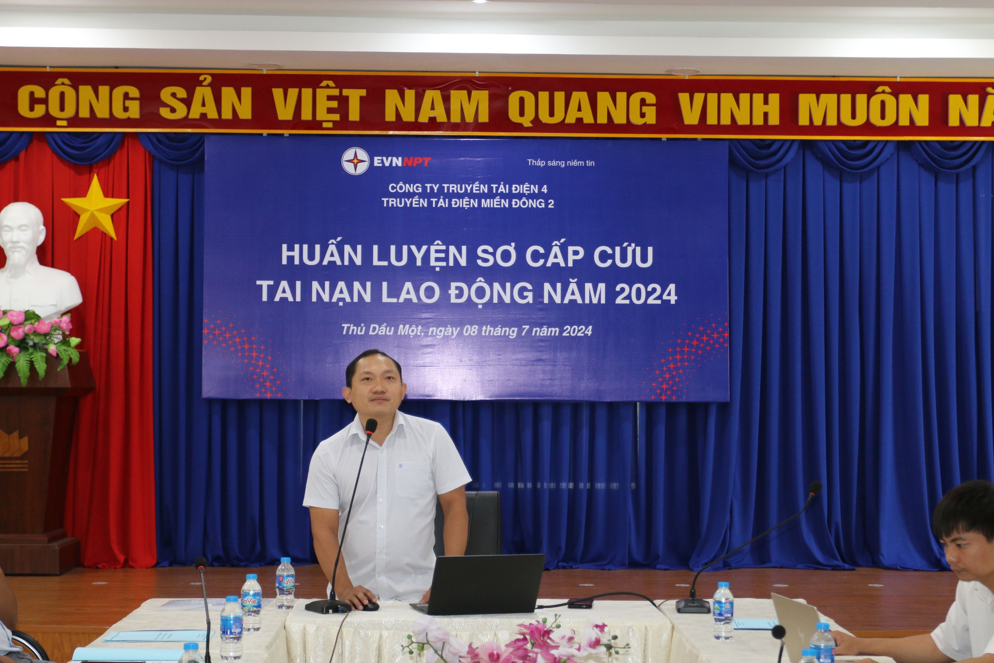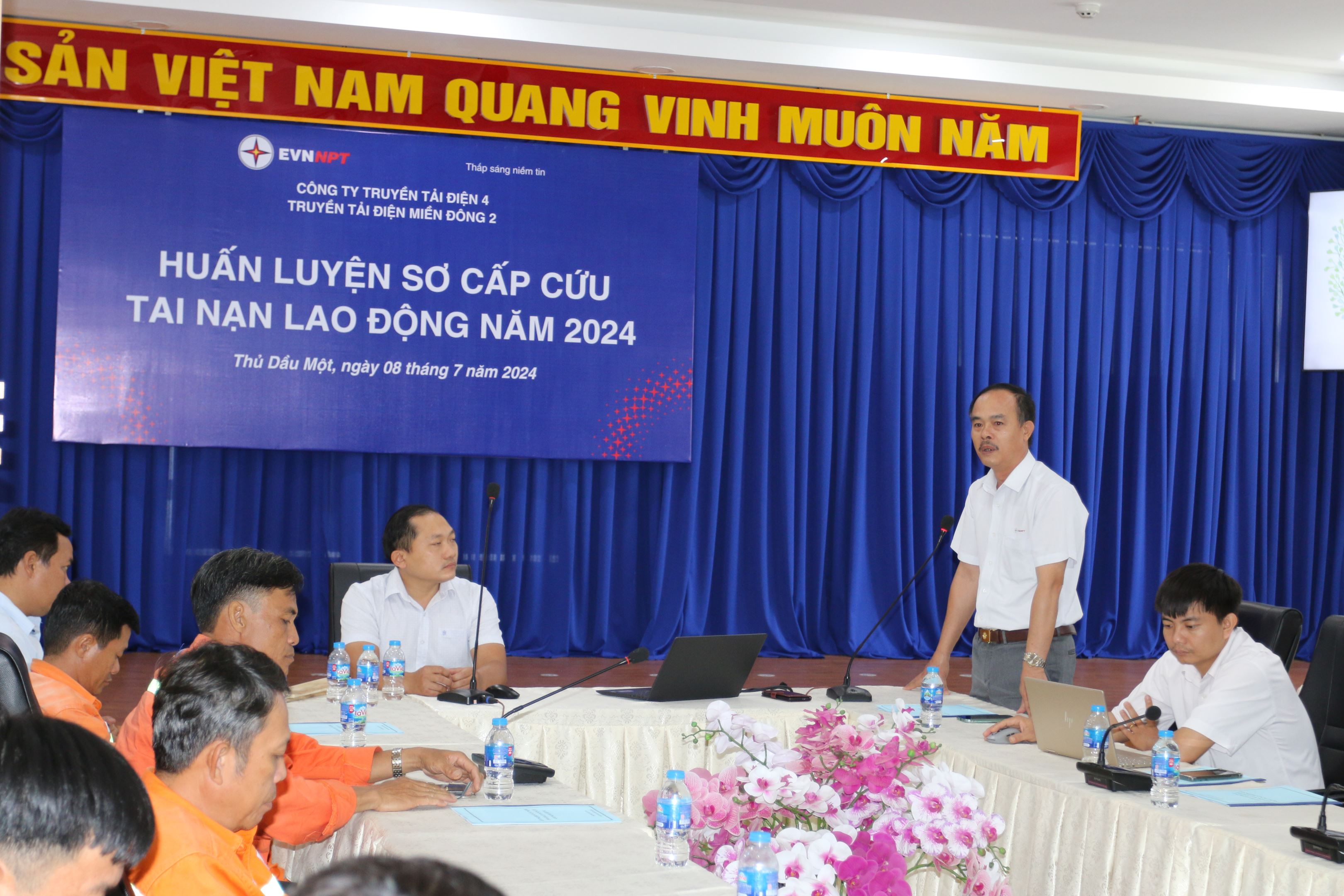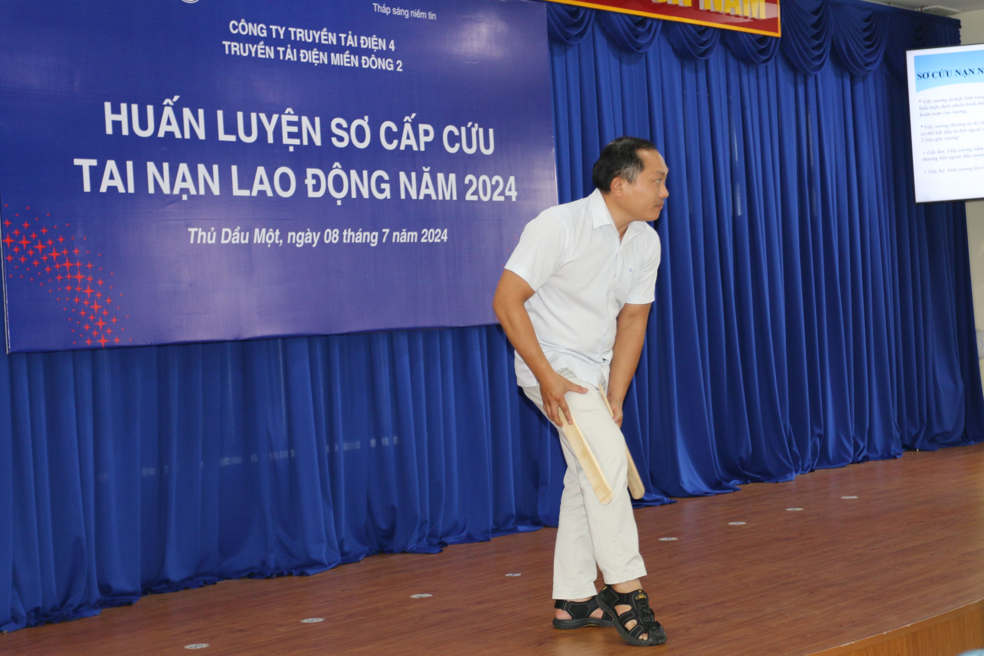 Tại lớp học CBCNV trong đơn vị được 02 Đổng Quốc Trưởng và BS Hoàng Nhật Minh - phòng khám đa khoa Sài Gòn An Thành truyền đạt phần lý thuyết với 13 nội dung bao gồm Nguyên tắc sơ cấp cứu ban đầu, hồi sức nhân tạo, sơ cứu nạn nhân bị nghẹt, sơ cứu nạn nhân bị điện giật, sơ cứu nạn nhân bị xỉu, sơ cứu nạn nhân bị hạ đường huyết, sơ cứu nạn nhân bị say nóng - say nắng, sơ cứu nạn nhân bị hạ canxi trong máu, sơ cứu nạn nhân chảy máu, băng bó vết thương, sơ cứu nạn nhân bỏng, sơ cứu nạn nhân gãy xương, cách dùng cáng cứu thương.