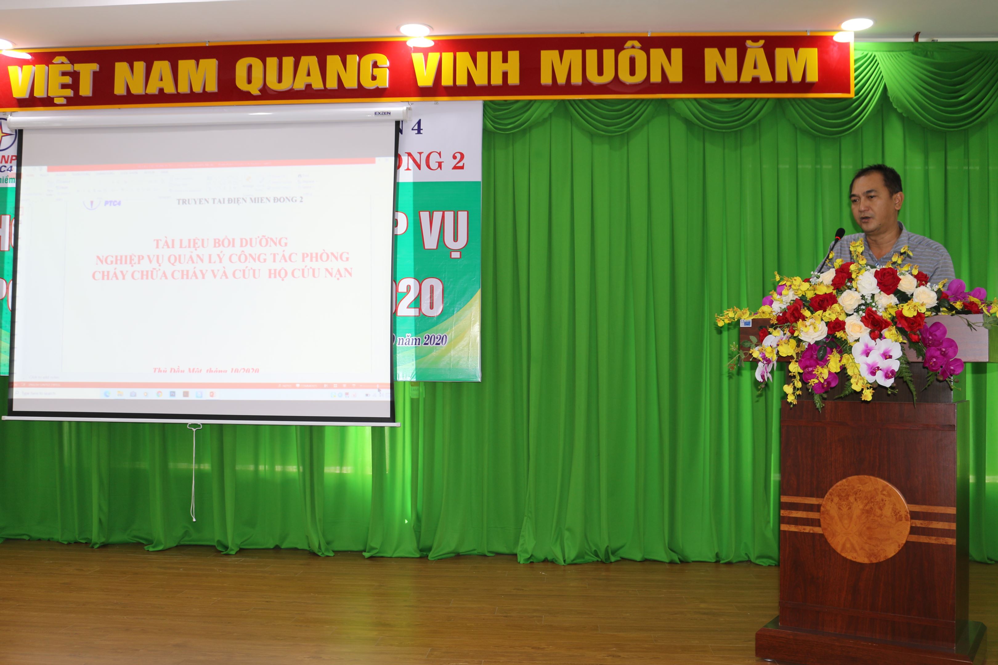 Hướng dẫn lớp học là ông Phùng Quang Đại, cán bộ Phụ trách PCCC và CNCH TTĐMĐ2. Tại buổi tập huấn, cán bộ hướng dẫn đã phổ biến các nội dung thực hiện và lưu Hồ sơ quản lý PCCC và CNCH theo văn bản 1716/PTC4-AT ngày 11/06/2020 của PTC4 gồm các văn bản quy định của Nhà nước, EVN, NPT, PTC4 đối với công tác PCCC&CNCH, hồ sơ thiết kế, nghiệm thu PCCC, phương án CNCH. Báo cáo kết quả tổ chức thực hiện, xử lý kiến nghị sau khi kiểm tra, thực tập phương án chữa cháy, Phương án CNCH; Diễn tập phương án chữa cháy; phương án CNCH. Kiểm tra an toàn về PCCC và CNCH; Văn bản kiến nghị xử lý tồn tại sau kiểm tra công tác PCCC và CNCH; Báo cáo kết quả thực hiện xử lý các kiến nghị, cách kiểm tra và thực hiện các sổ theo dõi như: công tác tuyên truyền, bồi dưỡng huấn luyện,thực tập phương án chữa cháy và CNCH, phương tiện phòng cháy và chữa cháy sổ theo dõi hoạt động các máy bơm Điện, Diesel, bù áp…….