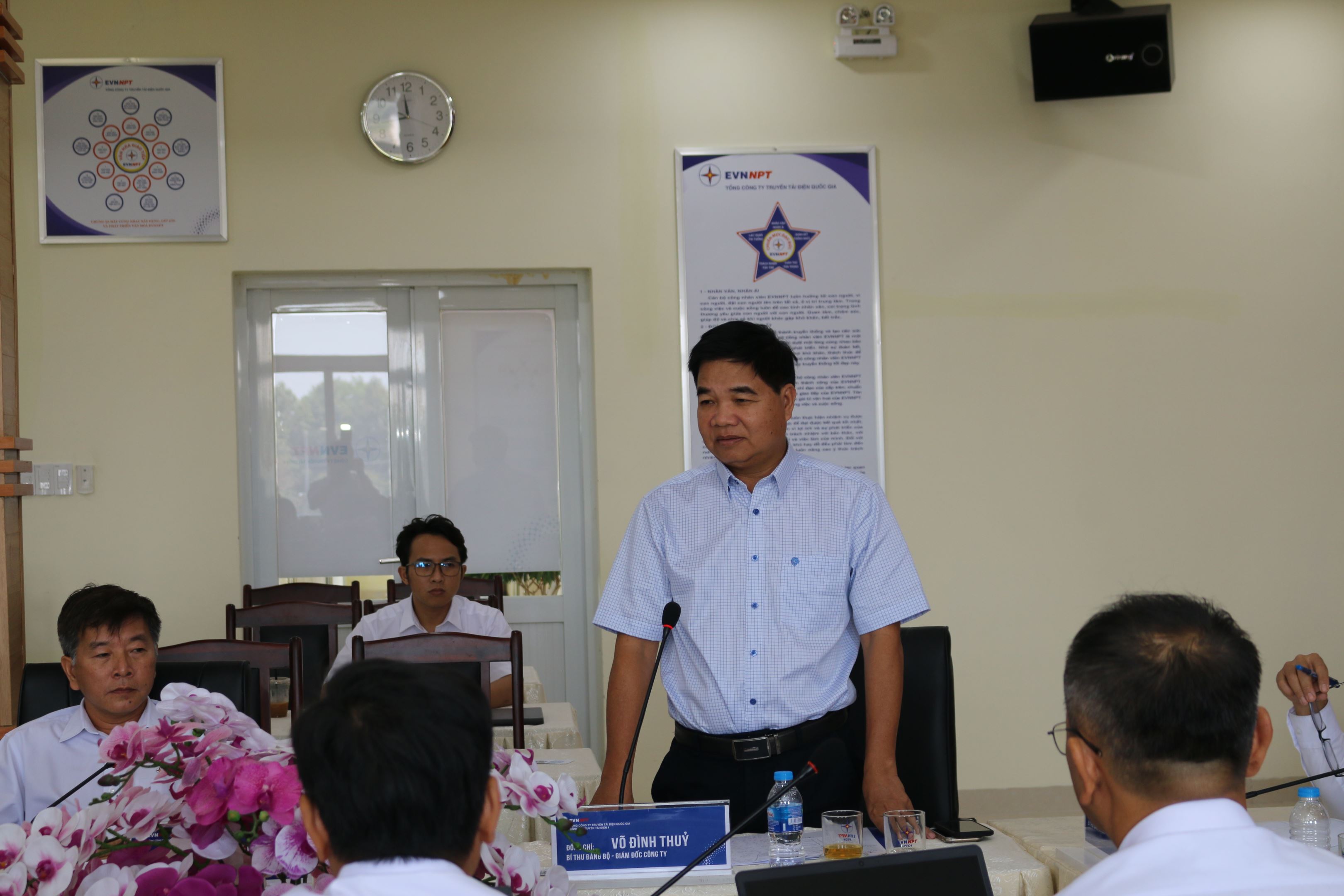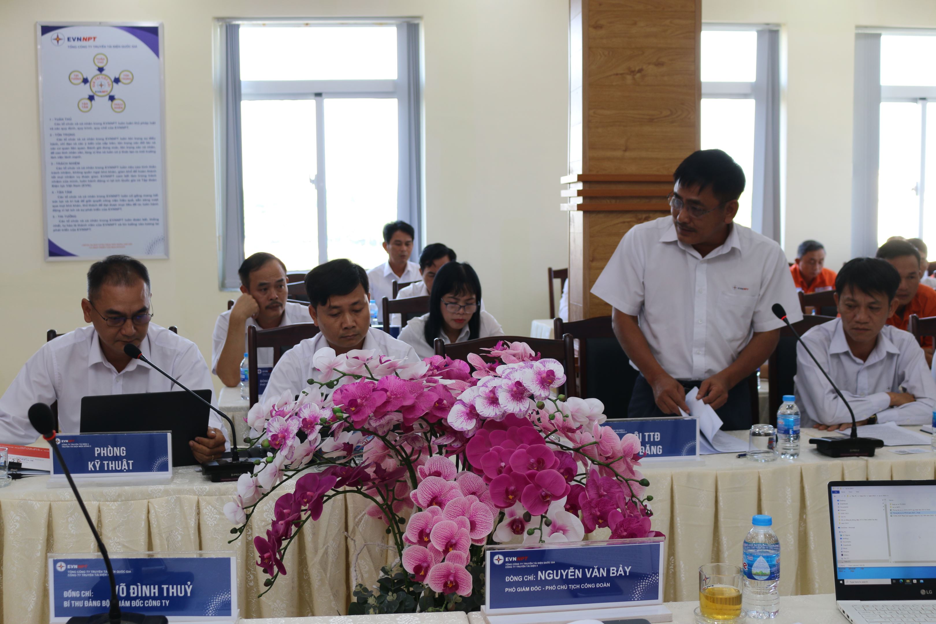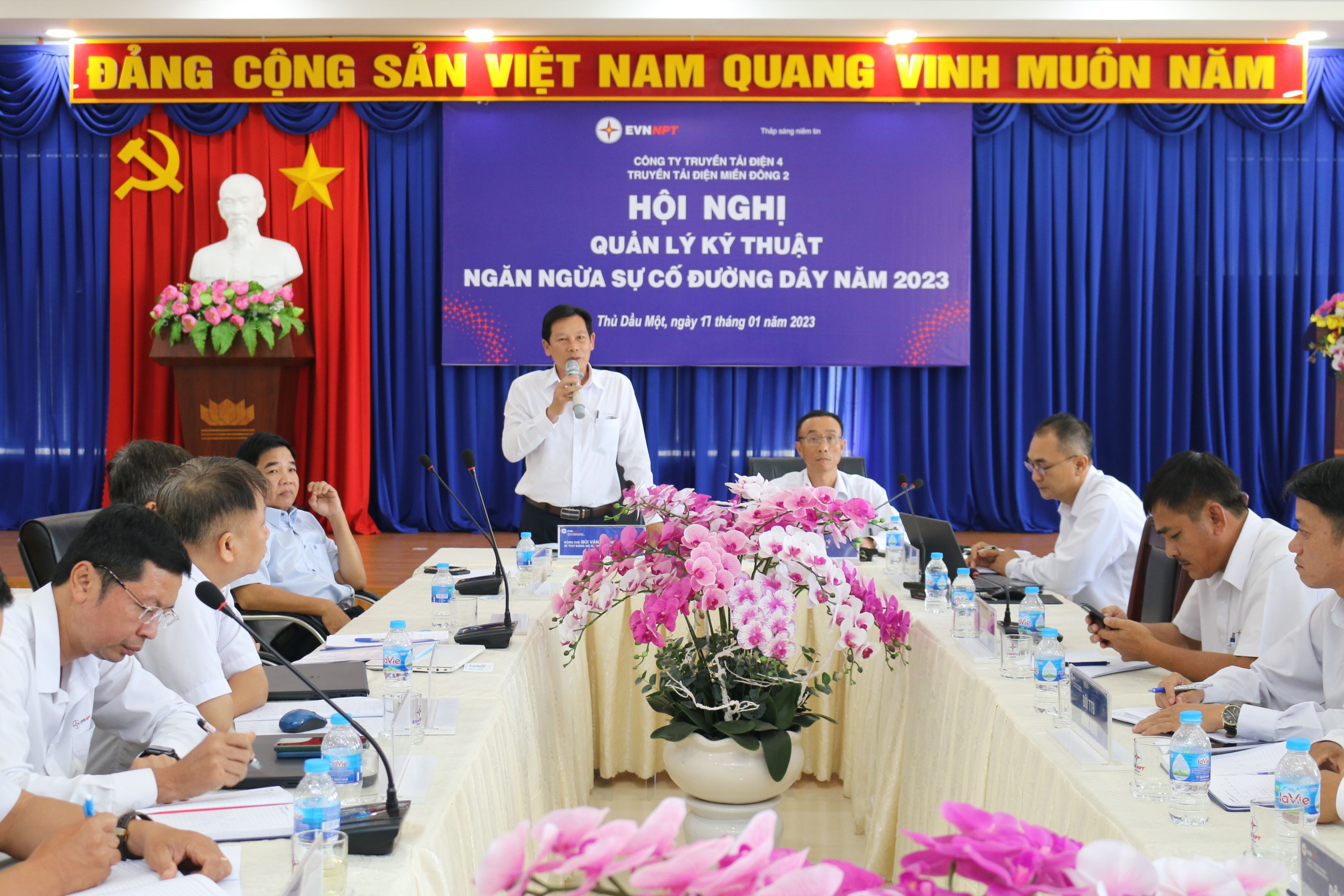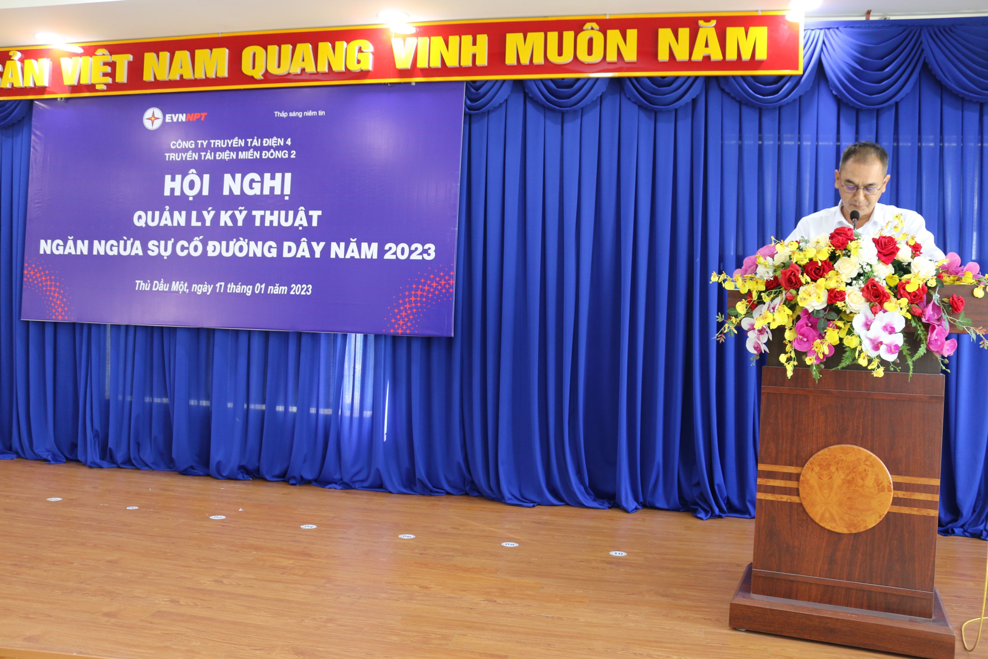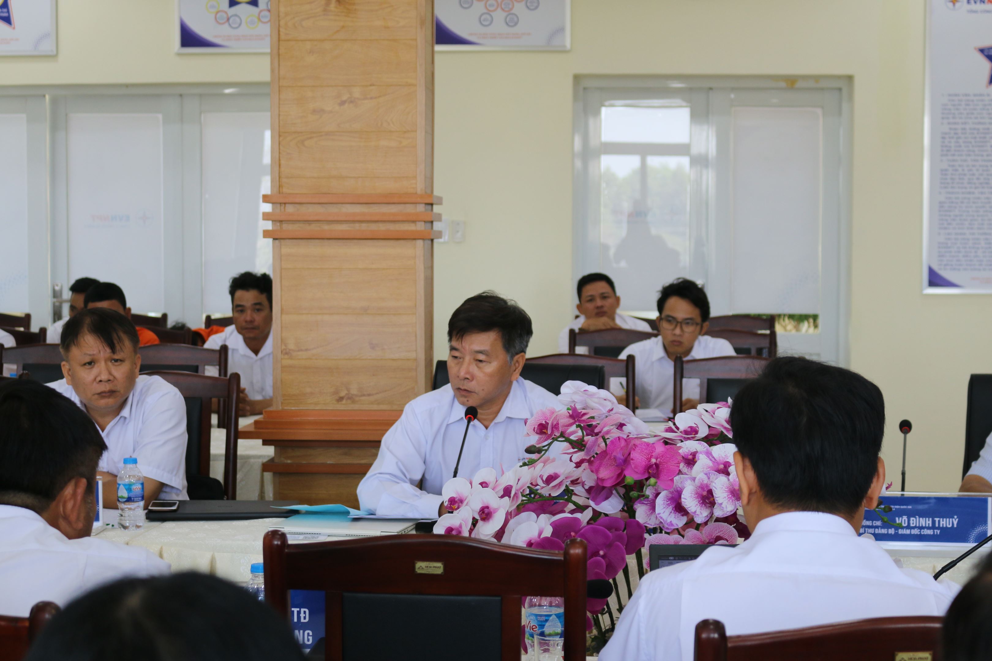 Phát biểu chỉ đạo hội nghị đ/c Võ Đình Thủy Bí thư Đảng ủy-Giám đốc Công ty triển khai thực hiện các nghị quyết giảm thiểu sự cố đường dây, nghiêm túc thực hiện các ý kiến chỉ đạo của lãnh đạo cấp trên, đề ra kế hoạch , chương trình hành động và rút ra các bài học kinh nghiệm để khắc phục, yêu cầu đơn vị “ không để xảy ra sự cố do cây vi phạm hành lang” đây là danh dự, uy tín đối với Công ty và Tổng công ty, kéo giảm sự cố do sét xuống 50%, tăng năng suất lao động 8%, siết chặt kỹ cương, kỹ luật trong quản lý vận hành, thực hiện công việc một cách chuyên nghiệp, nâng cao kỹ năng quản lý cho các đội trưởng, khả năng điều hành phân công nhiệm vụ cho người lao động chưa chặt chẽ. Ngoài ra đồng chí cũng yêu cầu đơn vị thực hiện tốt chủ đề năm 2023 của EVNNPT “Thực hành tiết kiệm chống lãng phí” cùng Nghị quyết số 35/NQ-HĐTV ngày 31/12/2022 của HĐTV Tổng công ty Truyền tải điện Quốc gia, gắn chặt việc thực thi Văn hóa EVNNPT với công tác quản lý kỹ thuật, quản lý vận hành; đảm bảo thực hiện đúng, đủ về giá trị “Tuân thủ, Tận Tâm, Trách nhiệm” của cá nhân trong công tác quản lý vận hành, quản lý kỹ thuật nhằm giảm thiểu sự cố trên lưới điện truyền tải.