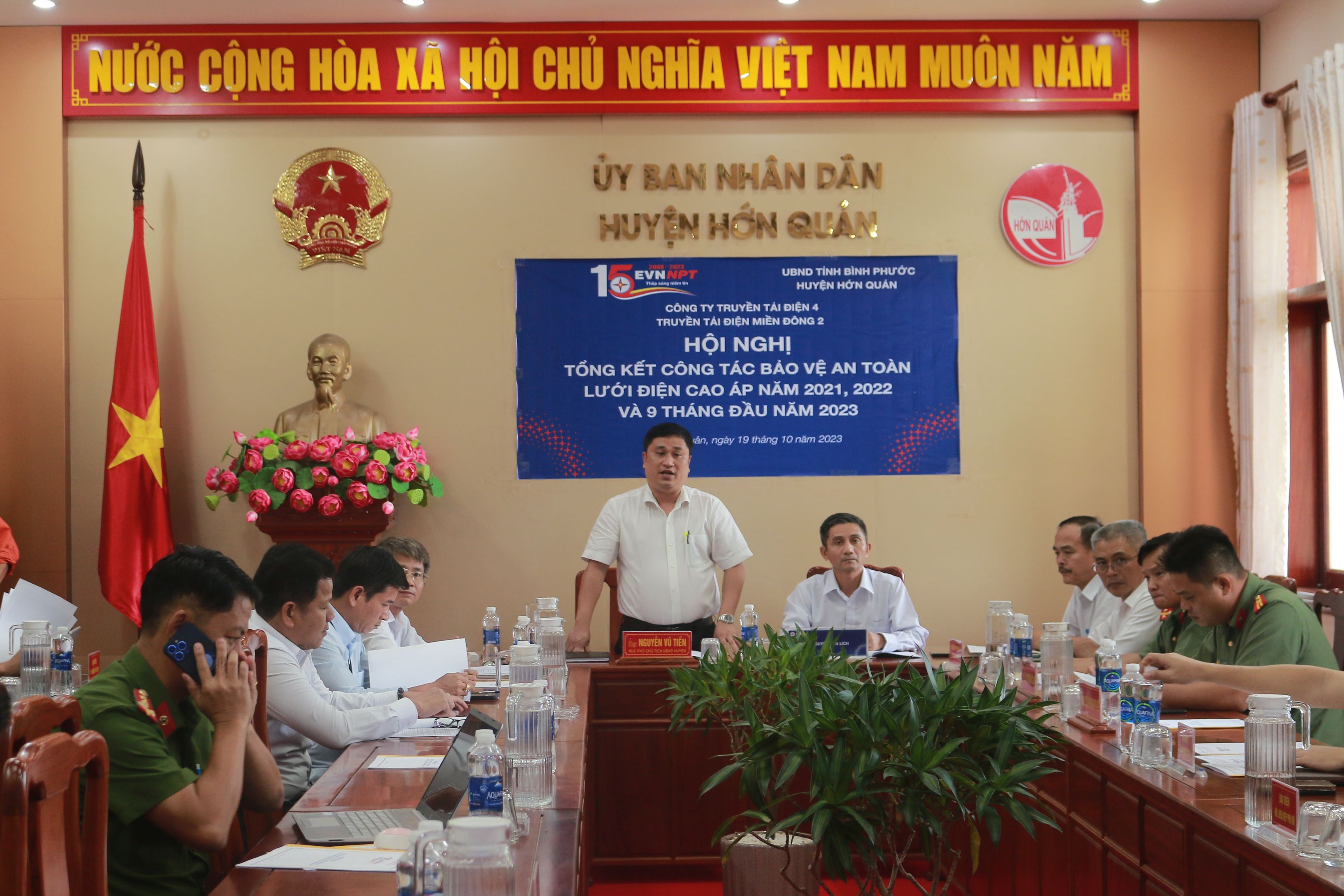 Tại Hội nghị Ông Đào Viết Trường - Trưởng phòng Tổng hợp, đại diện Truyền tải điện miền Đông 2 báo cáo tổng kết công tác tuyên truyền bảo vệ hành lang lưới điện cao áp năm 2021, 2022 và 9 tháng đầu năm 2023 trên địa bàn huyện. Cơ cấu hệ thống lưới điện cũng như các tồn tại liên quan đến công tác bảo vệ an toàn hành lang lưới điện cao áp.