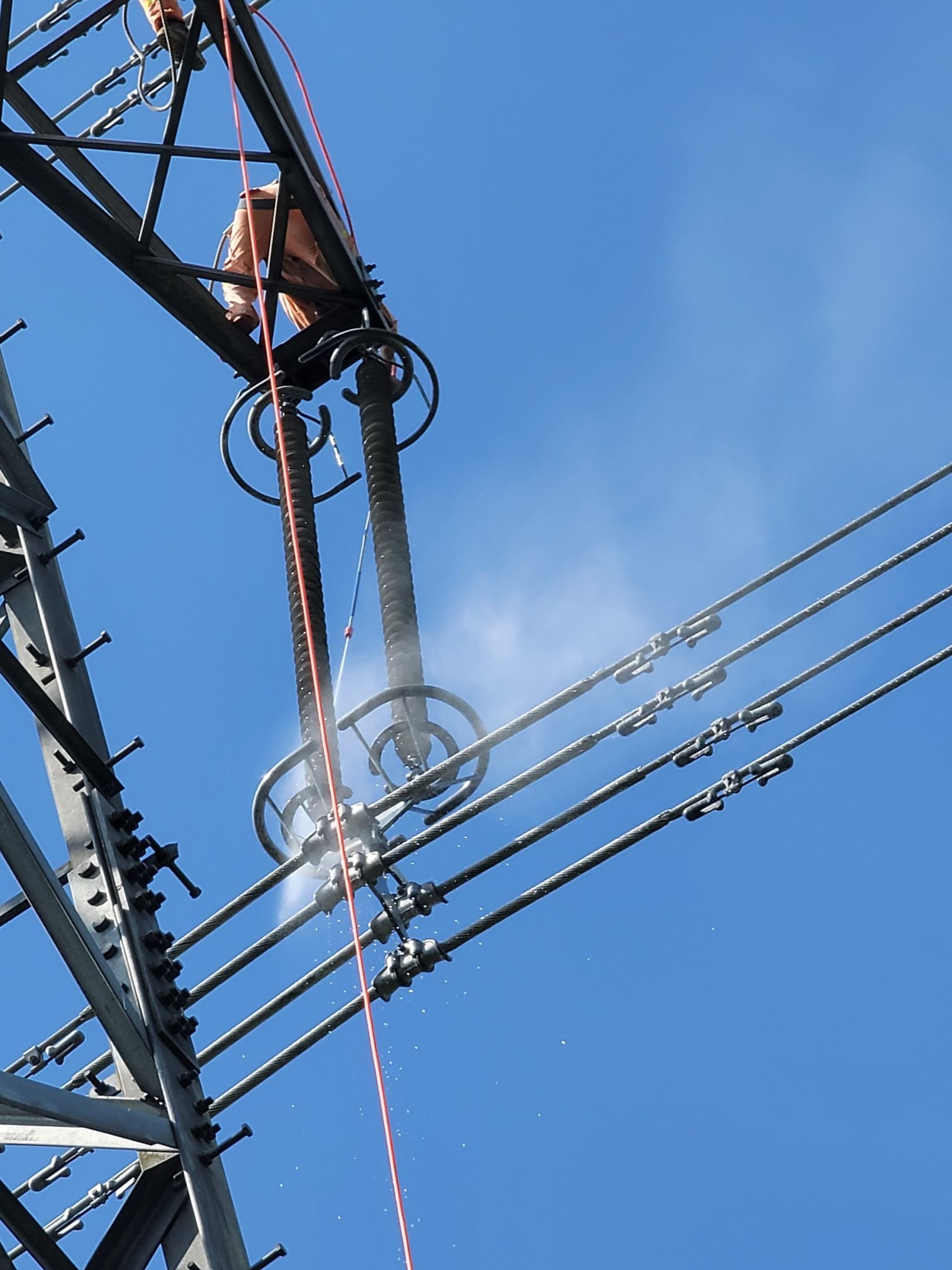 Vệ sinh cách điện composite bằng nước áp lực thấp chuẩn bị vận hành đường dây 500kV Long Phú - Ô Môn.