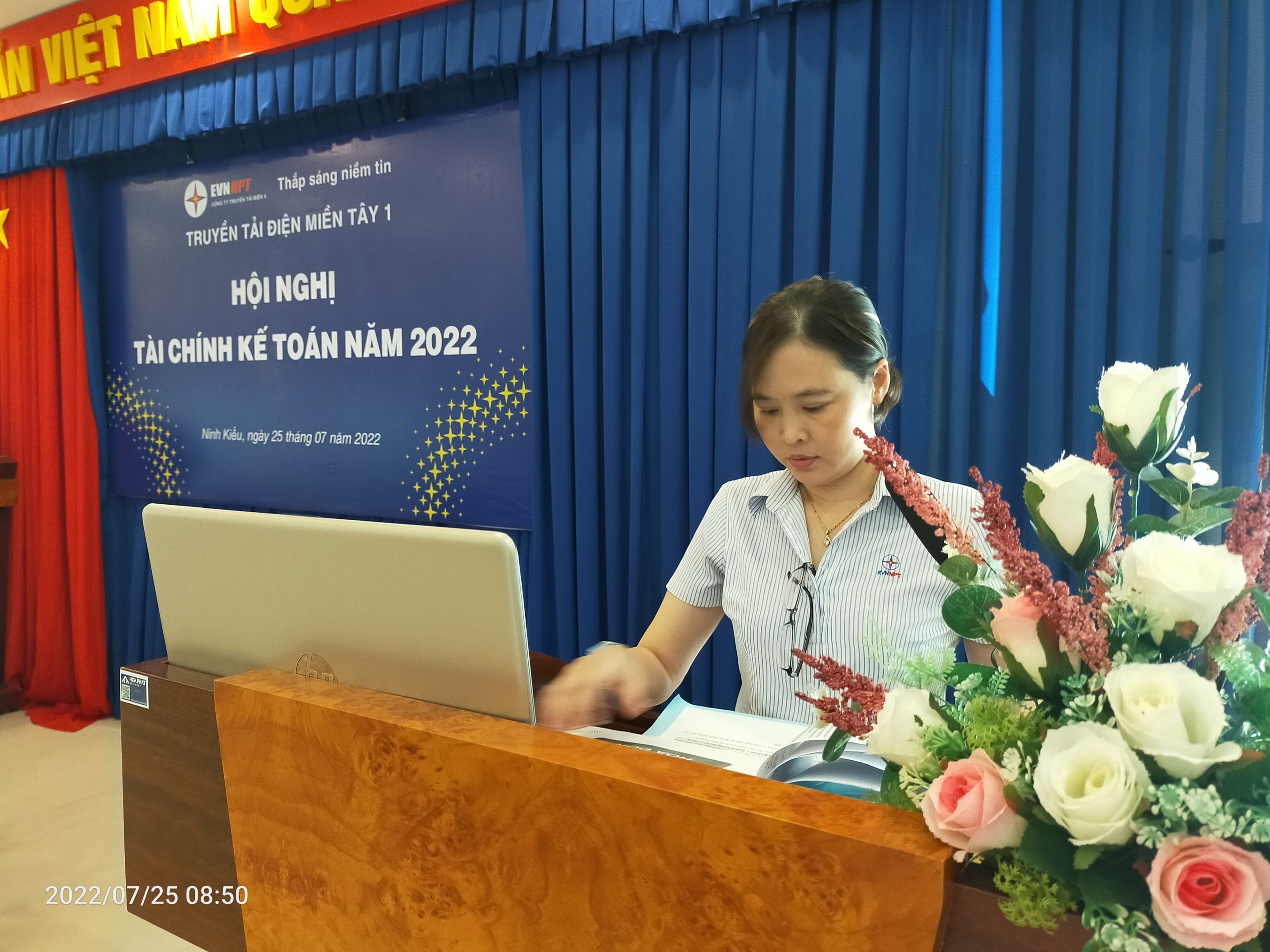 Chị Nguyễn Thụy Phương Nghi, Trưởng Phòng Tài Chính Kế toán (TTĐMT1) trình bày các quy định về hoá đơn điện tử, nghị định số 15/NĐ-CP, ngày 28/01/2022 về các chính sách miễn, giảm thuế GTGT từ 10% xuống 8% áp dụng từ ngày 01/02/2022 đến 31/12/2022 theo Nghị quyết số: 43/2022/QH15 ngày 11/01/2022. Trình bày các nội dung trong hướng dẫn quy định chi tiêu nội bộ và thanh toán, quyết toán của Công ty Truyền tải điện 4 được áp dụng cho Truyền tải điện Miền tây 1. Hướng dẫn cho các đơn vị cấp 5 các nội dung liên quan công tác tài chính.