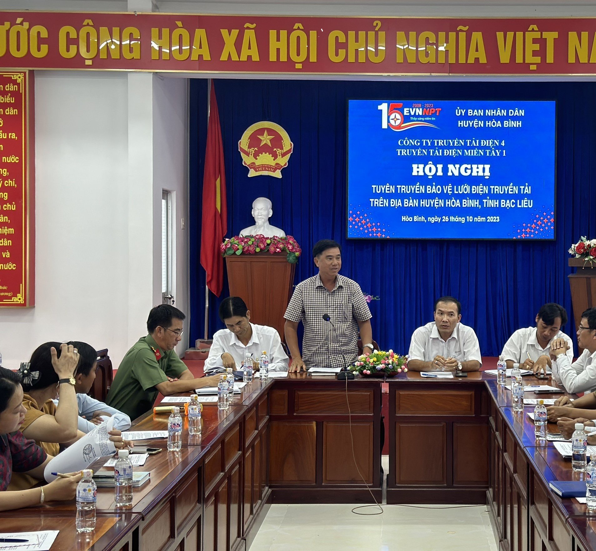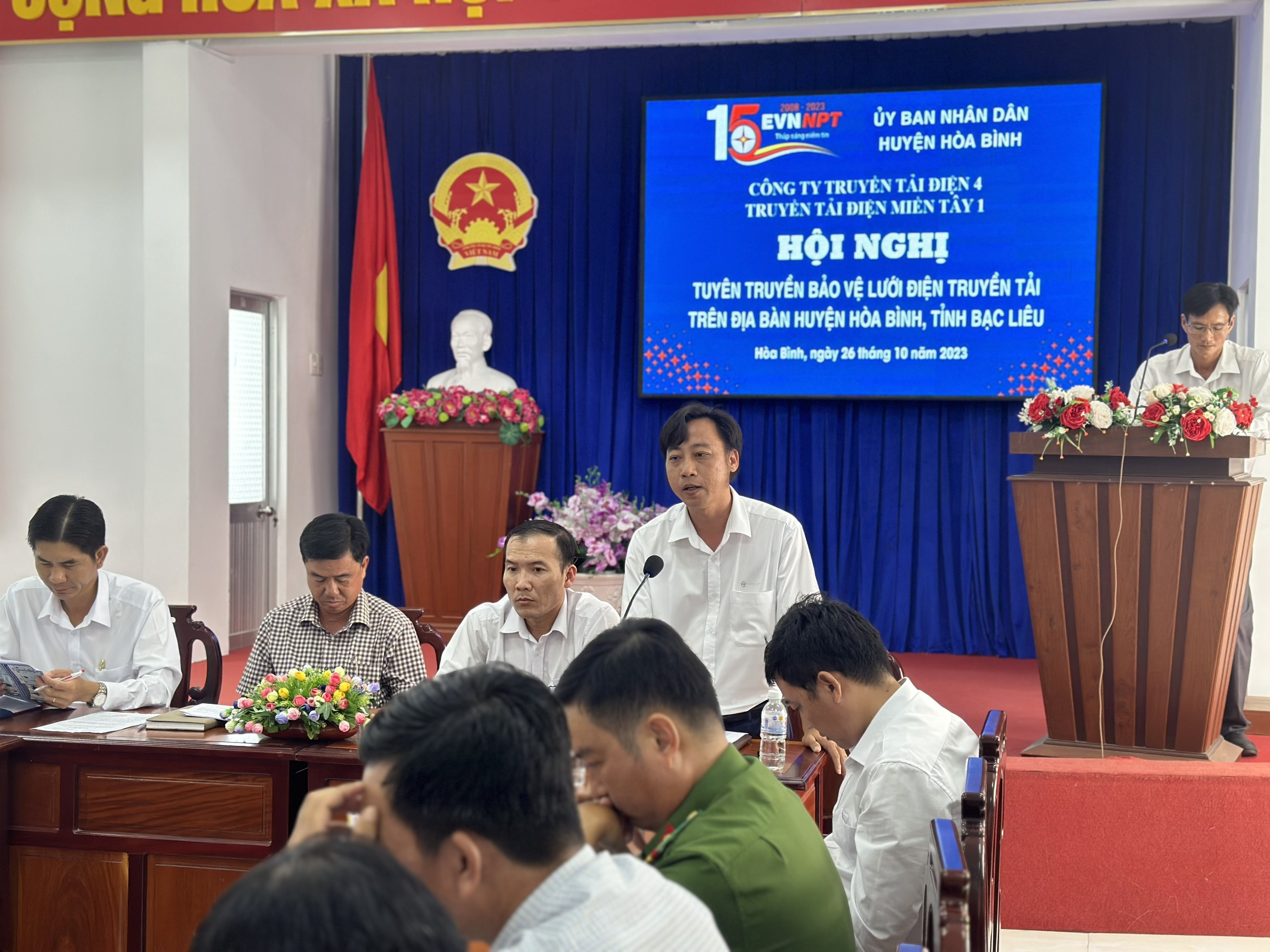 Tham dự hội nghị có ông Huỳnh Văn Tính -Trưởng phòng Phòng KT&HT - Chủ trì hội nghị; đại diện Lãnh đạo công an huyện Hoà Bình, các phòng, ban chuyên môn của huyện Hoà Bình và đại diện lãnh đạo UBND các xã có đường dây 220kV đi qua. Tham dự hội nghi còn có các báo, đài đến viết bài đưa tin (Đài phát thanh huyện và Cổng thông tin điện tử huyện Hoà Bình…). Về phía Truyền tải điện miền Tây 1 có ông Phạm Ngọc Luật - Phó giám đốc TTĐ miển Tây 1, ông Lê Quốc Hưng - Đội Trưởng cùng các CBCNV đội TTĐ Bạc Liêu.