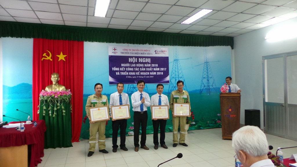 Ông Lý Ngọc Khánh - Phó Giám đốc Công ty Truyền tải điện 4 - Trao Giấy khen tặng đạt danh hiệu "Chiến sĩ thi đua Cơ sở năm 2017" của Tổng Công ty Truyền tải điện Quốc gia cho các cá nhân .