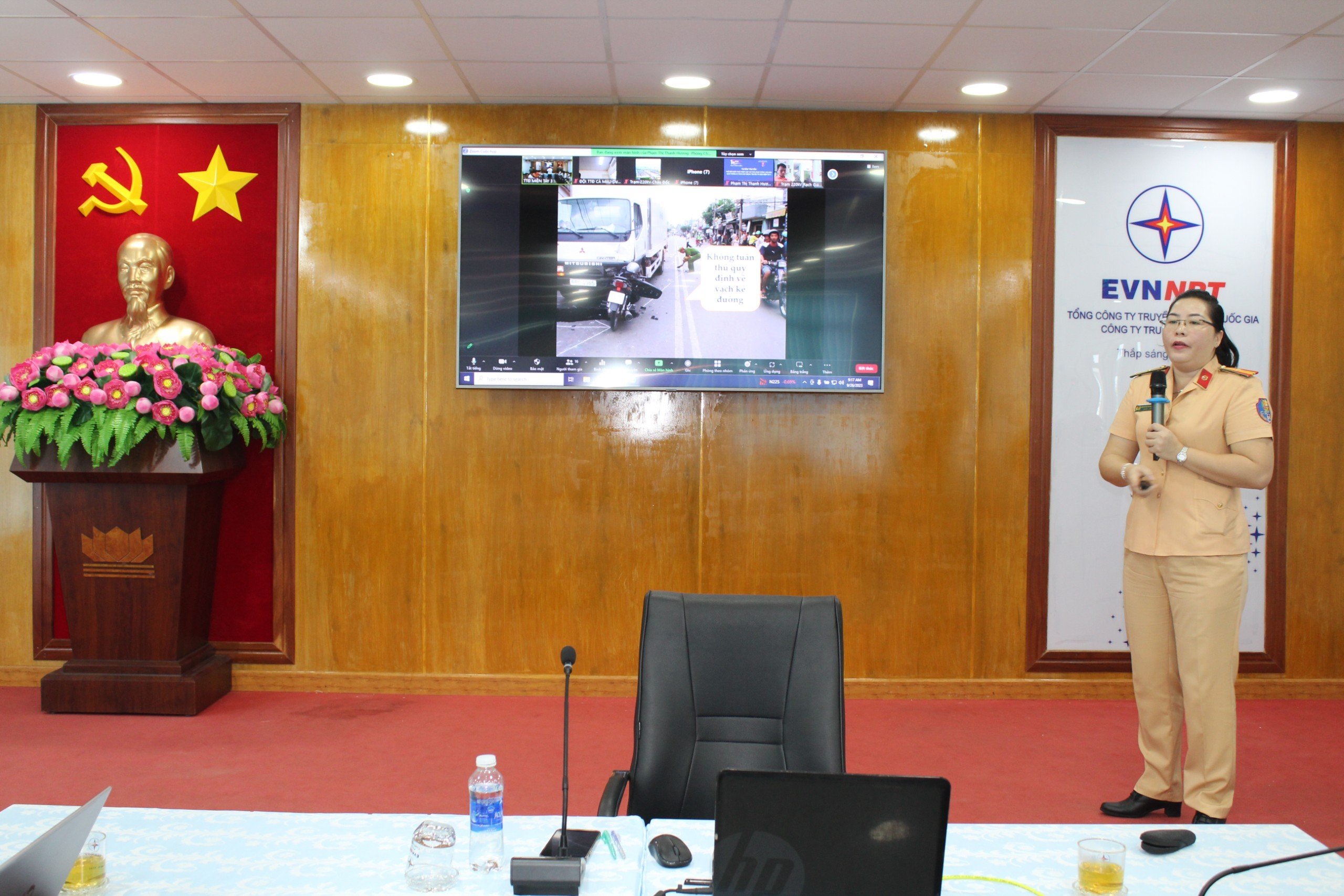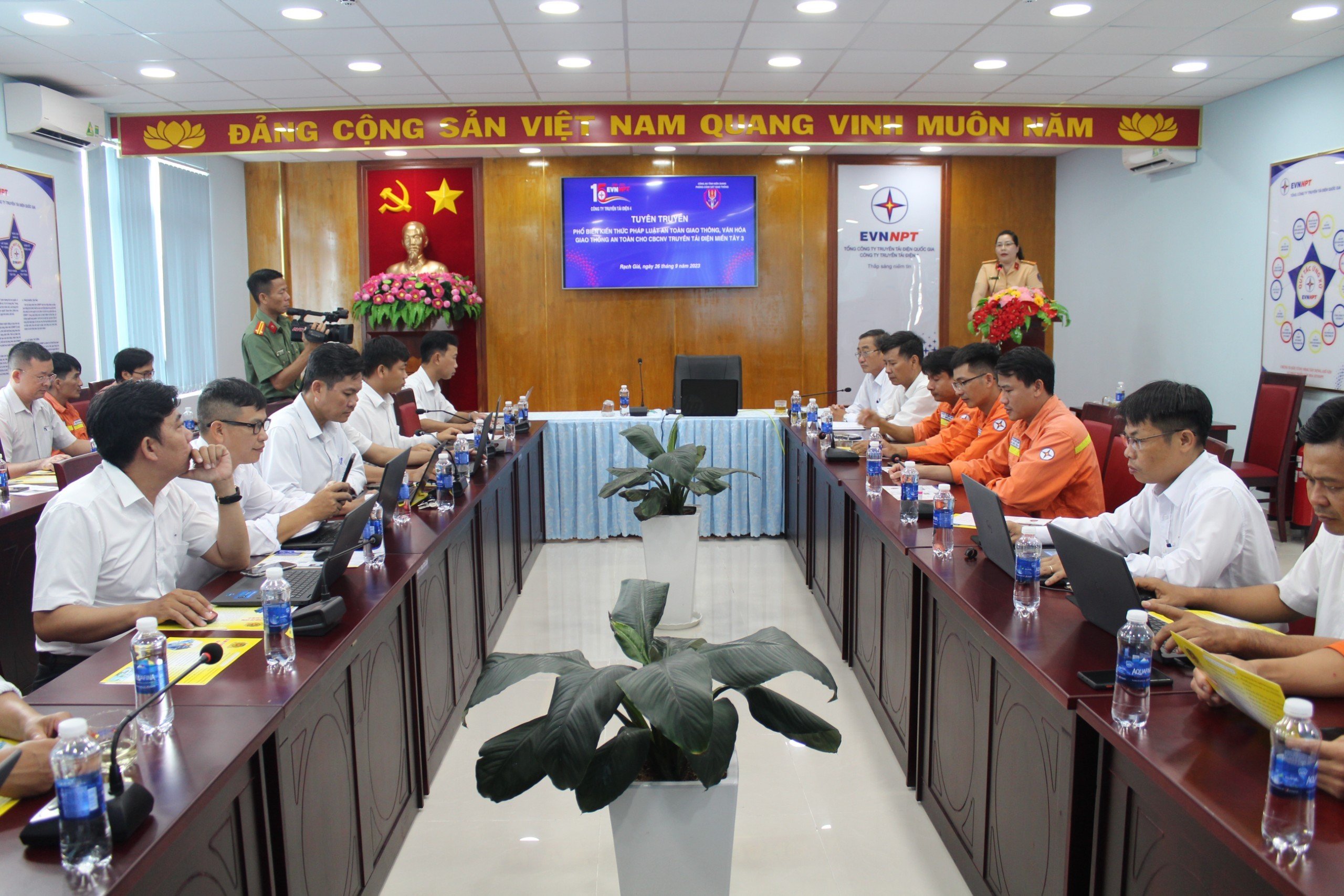 Báo cáo viên tuyên truyền là Thiếu tá Phạm Thị Thanh Hương cán bộ Đội tuyên truyền Phòng Cảnh sát giao thông Công an tỉnh Kiên Giang. Tham dự lớp học tại hội trường Truyền tải điện miền Tây 3 và kết nối trực tuyến qua Zoom Meeting với sự hiện diện của 112/112 CBCNV đến từ Ban Giám đốc, Công đoàn, Chi đoàn thanh niên, các phòng, đội, trạm, tổ thao tác lưu động trực thuộc. Ngoài ra còn có phóng viên công an tỉnh Kiên Giang đưa tin.