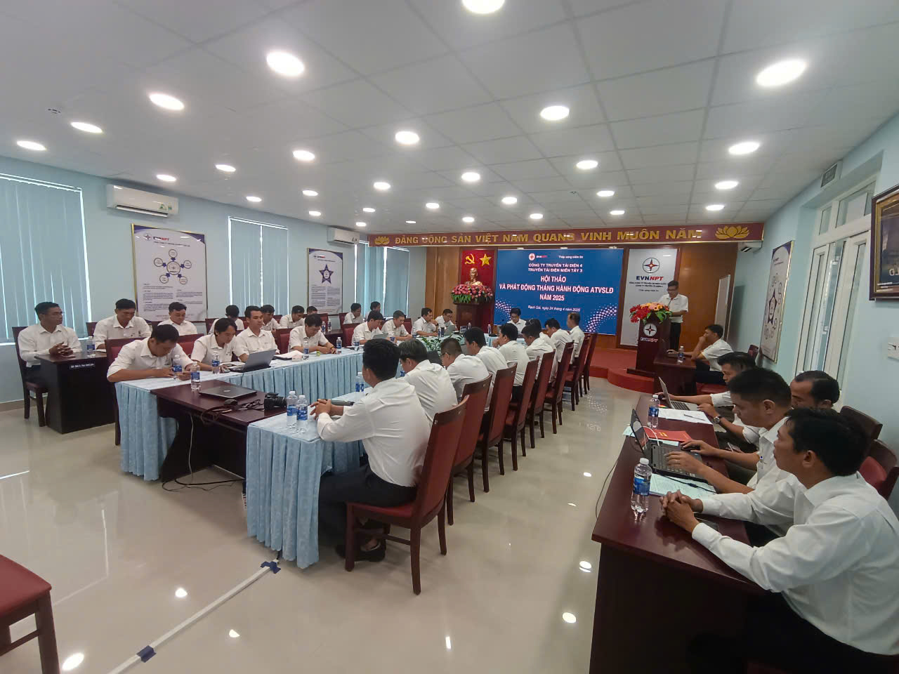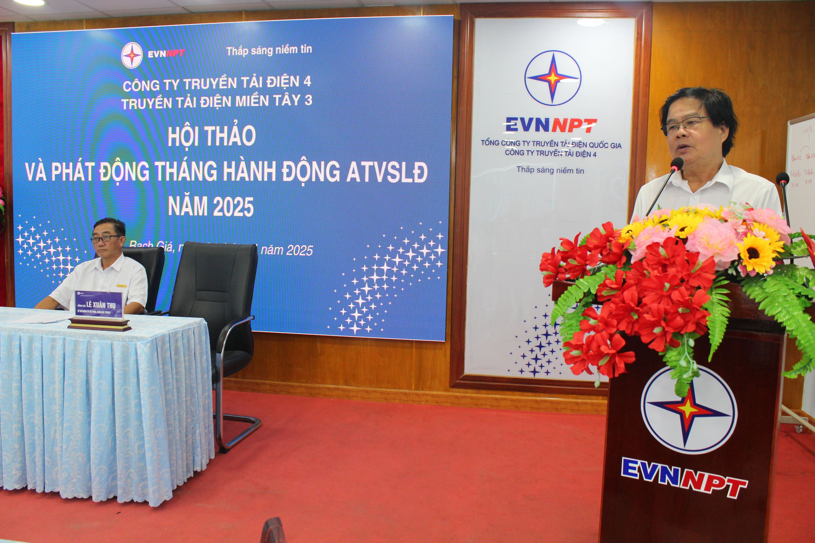 Phát biểu kết luận hội thảo ông Lê Xuân Thụ - Giám đốc Truyền tải điện miền Tây 3 nhấn mạnh việc đẩy mạnh tuyên truyền, nâng cao nhận thức cho toàn thể cán bộ, người lao động, trưởng các phòng, tổ, đội, trạm và người lao động trong việc thực hiện Luật ATVSLĐ và các quy định, chỉ đạo về công tác ATVSLĐ bám sát chủ đề tháng hành động ATVSLĐ năm 2025 là: “Tăng cường đánh giá, nhận diện nguy cơ, rủi ro và chủ động triển khai các biện pháp bảo đảm an toàn, vệ sinh lao động tại nơi làm việc”; Ông cũng yêu cầu các đơn vị biên soạn, trình duyệt quy trình vận hành thiết bị, dụng cụ an toàn, dụng cụ thi công, huấn luyện người lao động sử dụng thành thạo các dụng cụ, tổ chức đào tạo và cấp chứng chỉ cho người vận hành thiết bị nâng, thiết bị nâng Truyền tải điện miền Tây 3 đang quản lý như: Palăng kéo tay, tời tay, tời điện dùng để nâng tải, palăng điện – Mục 14, 16, 17 Danh mục các loại máy, thiết bị, vật tư, các chất có yêu cầu nghiêm ngặt về ATVSLĐ tại Thông tư số 36/2019/TT-BLĐTBXH ngày 30 tháng 12 năm 2019) và xe nâng người (Mục 19, Danh mục của Thông tư số 36/2019/TT-BLĐTBXH).