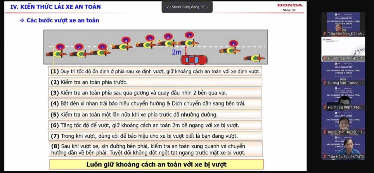 Sau khi phần trình bày nội dung, các học viên đã tham gia bài kiểm tra cuối khóa online bằng hình thức trắc nghiệm, kết quả đều đạt theo yêu cầu của Công ty Honda Việt Nam.
