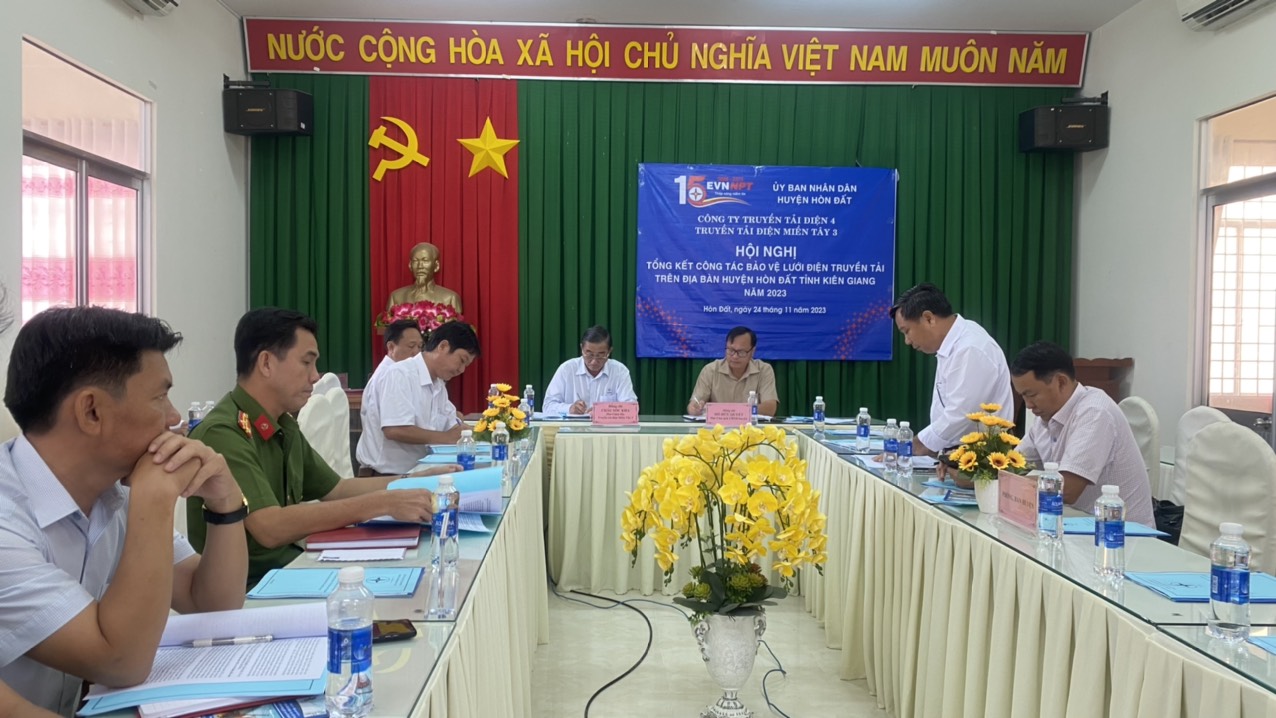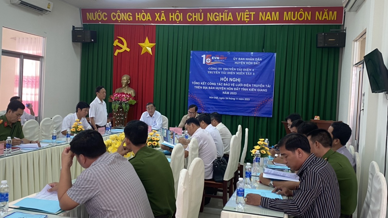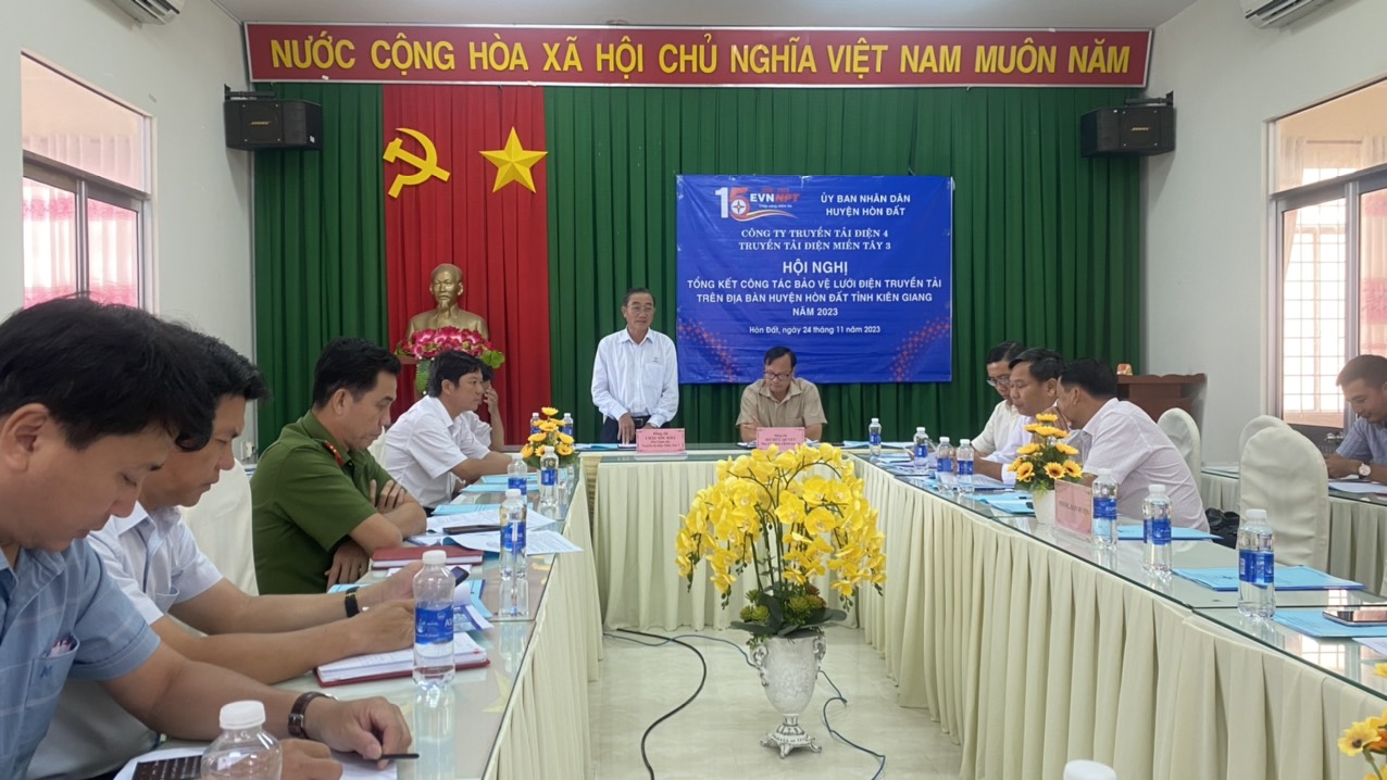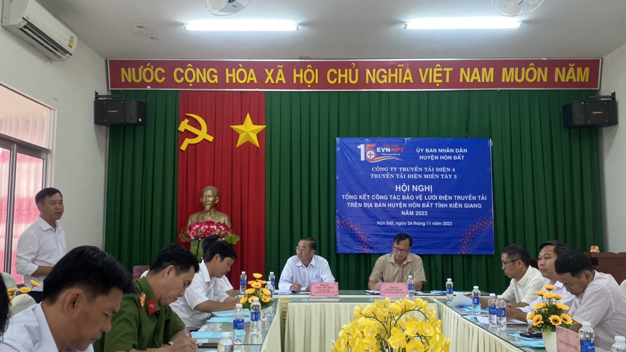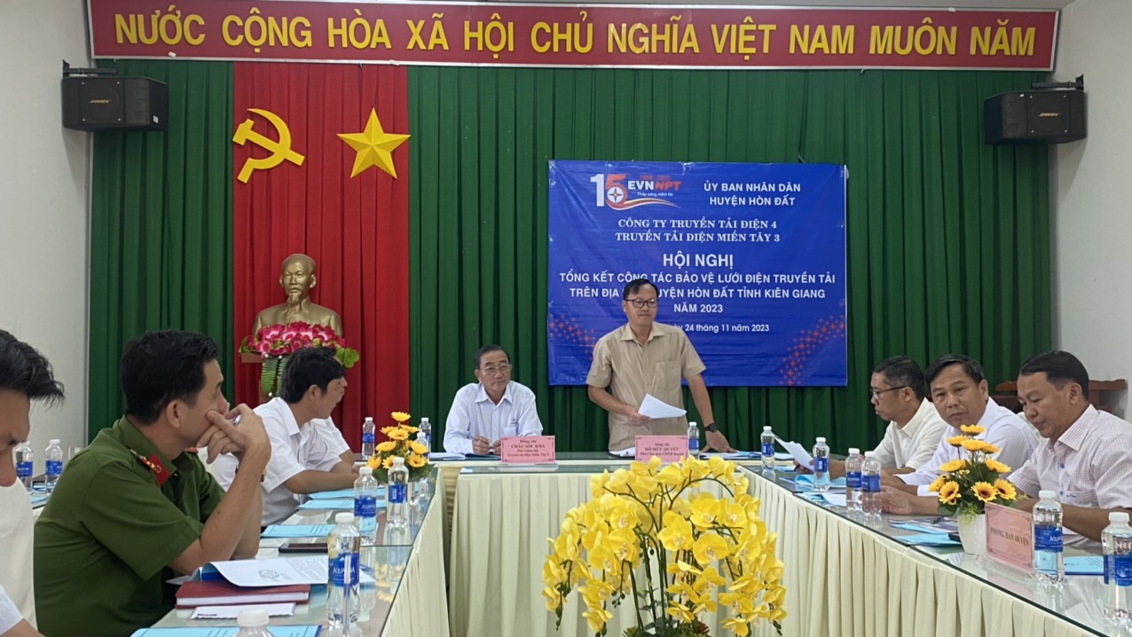 Tại Hội nghị, đồng chí Đào Văn Chương - Đội trưởng Đội truyền tải điện Rạch Giá đã trình bày báo cáo tổng kết công tác bảo vệ hành lang an toàn lưới điện cao áp năm 2023 trên địa bàn huyện và tầm quan trọng của 02 tuyến đường dây 220 kV Rạch Giá – Kiên Bình, đường dây 220 kV Kiên Bình – Châu Đốc với tổng số 139 trụ điện trải dài trên địa bàn xã, thị trấn thuộc huyện Hòn Đất cung cấp điện cho khu vực huyện Hòn Đất, huyện Kiên Lương, TP Hà Tiên, TP Phú Quốc, kết nối lưới điện với khu vực Châu Đốc để cung cấp điện cho nước bạn Campuchia. Ngoài ra đường dây làm nhiệm vụ kết nối mạch vòng vùng tứ giác Long Xuyên, bao gồm Rạch Giá – Kiên Bình – Châu Đốc – Thốt Nốt – Rạch Giá liên kết với hệ thống lưới điện Quốc gia.