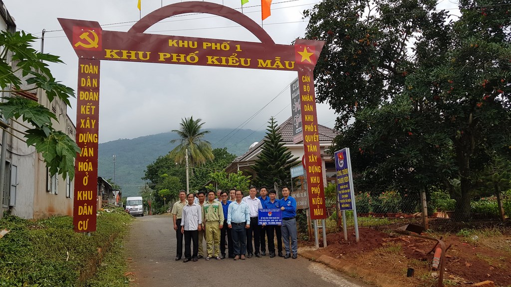 Đại diện hai đơn vị và chính quyền địa phương chụp hình lưu niệm tại cổng chào khu phố.