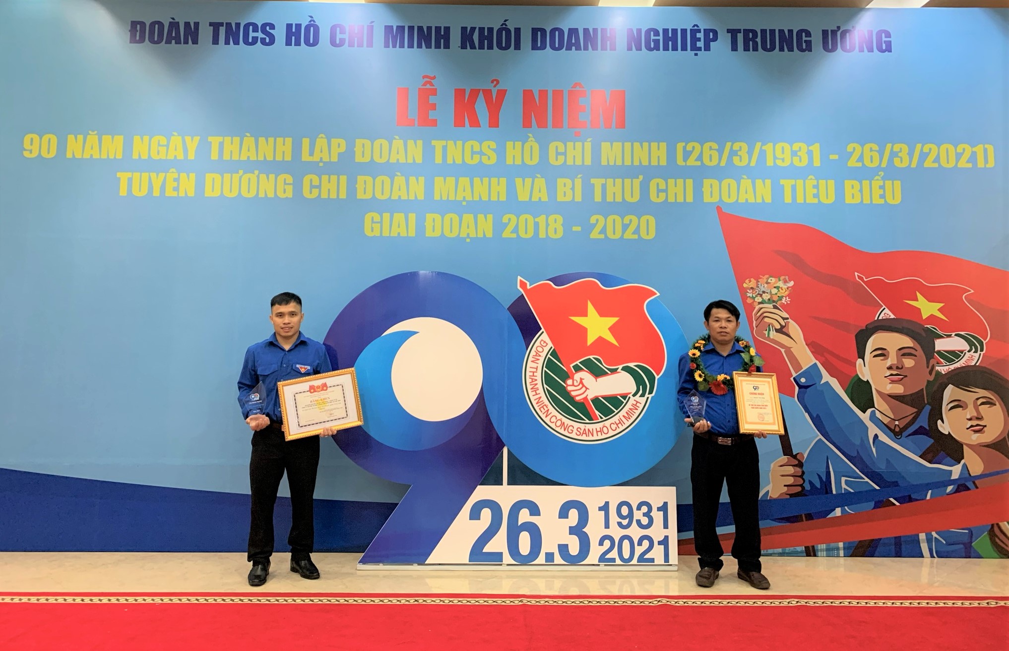 Đồng chí Huỳnh Thái Hiệp (bên phải) – Bí thư Chi đoàn Truyền tải điện Miền Tây 3 được tuyên dương là Bí thư Chi đoàn tiêu biểu toàn quốc năm 2021 và Bí thư Chi đoàn Truyền tải điện Miền Đông 1 (bên trái) đại diện Chi đoàn được tuyên dương Chi đoàn mạnh Khối Doanh nghiệp Trung ương giai đoạn 2018 – 2020.