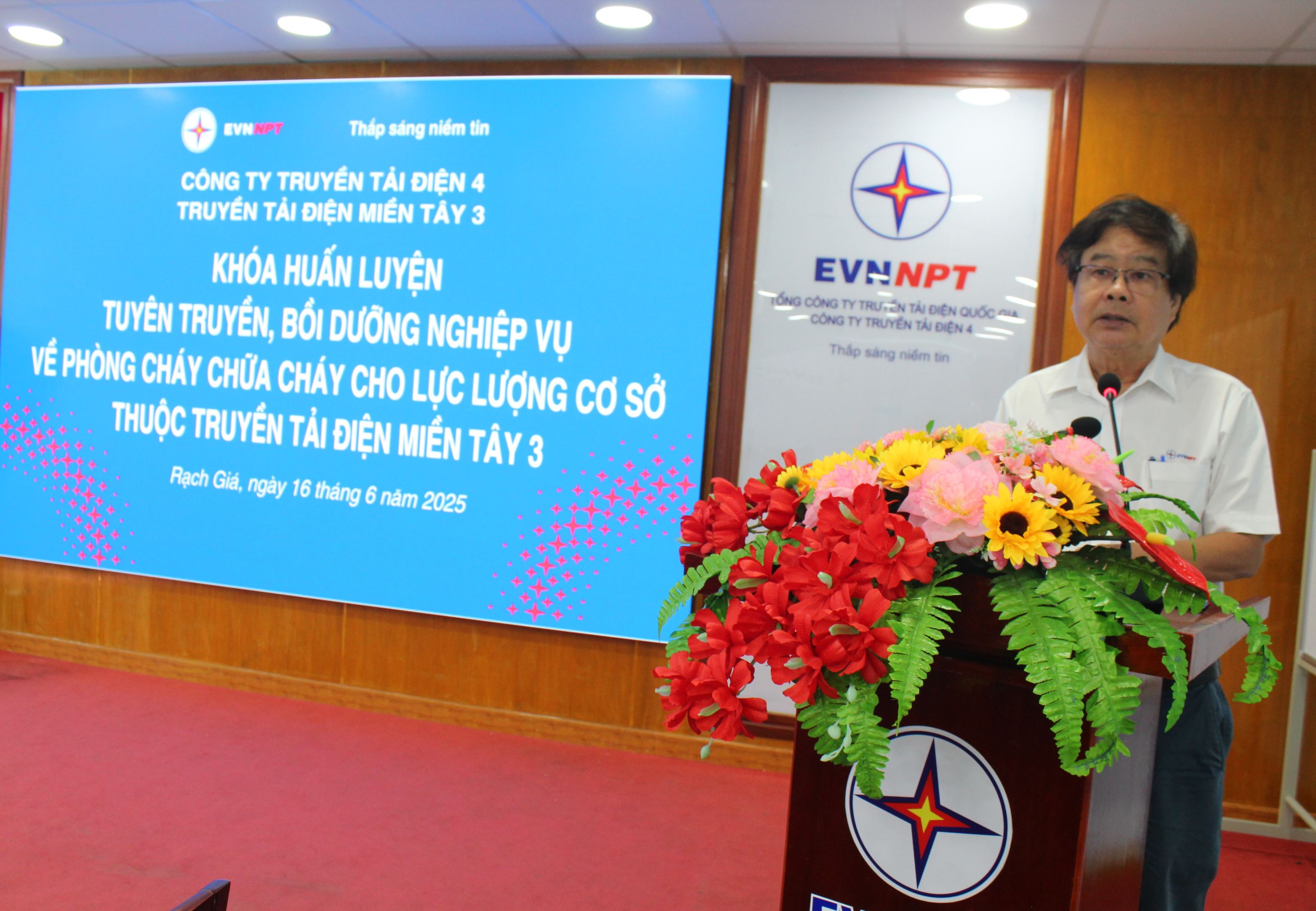 Phát biểu khai mạc khóa huấn luyện tuyên truyền, bồi dưỡng nghiệp vụ về phòng cháy chữa cháy cho lực lượng PCCC cho lực lượng cơ sở, đồng chí Lê Xuân Thụ - Bí thư Đảng ủy bộ phận, Giám đốc Truyền tải điện miền Tây 3 nhấn mạnh: việc tổ chức lớp tuyên truyền pháp luật về phòng cháy chữa cháy là việc làm vô cùng cấp thiết nhằm nâng cao nhận thức, vai trò, trách nhiệm của các cấp ủy đảng, chính quyền, người đứng đầu, cán bộ phụ trách công tác PCCC, đặc biệt lực lượng PCCC cơ sở đối với việc chấp hành các quy định, tổ chức các hoạt động PCCC, chủ động làm tốt công tác phòng ngừa và đảm bảo lực lượng, phương tiện kịp thời xử lý sự cố cháy, nổ xảy ra ngay từ giai đoạn ban đầu, không để xảy ra cháy lan, cháy lớn gây thiệt hại nghiêm trọng về người và tài sản. Phát huy hiệu quả phương châm 4 tại chỗ (lực lượng tại chỗ, phương tiện tại chỗ, hậu cần tại chỗ và chỉ huy tại chỗ).