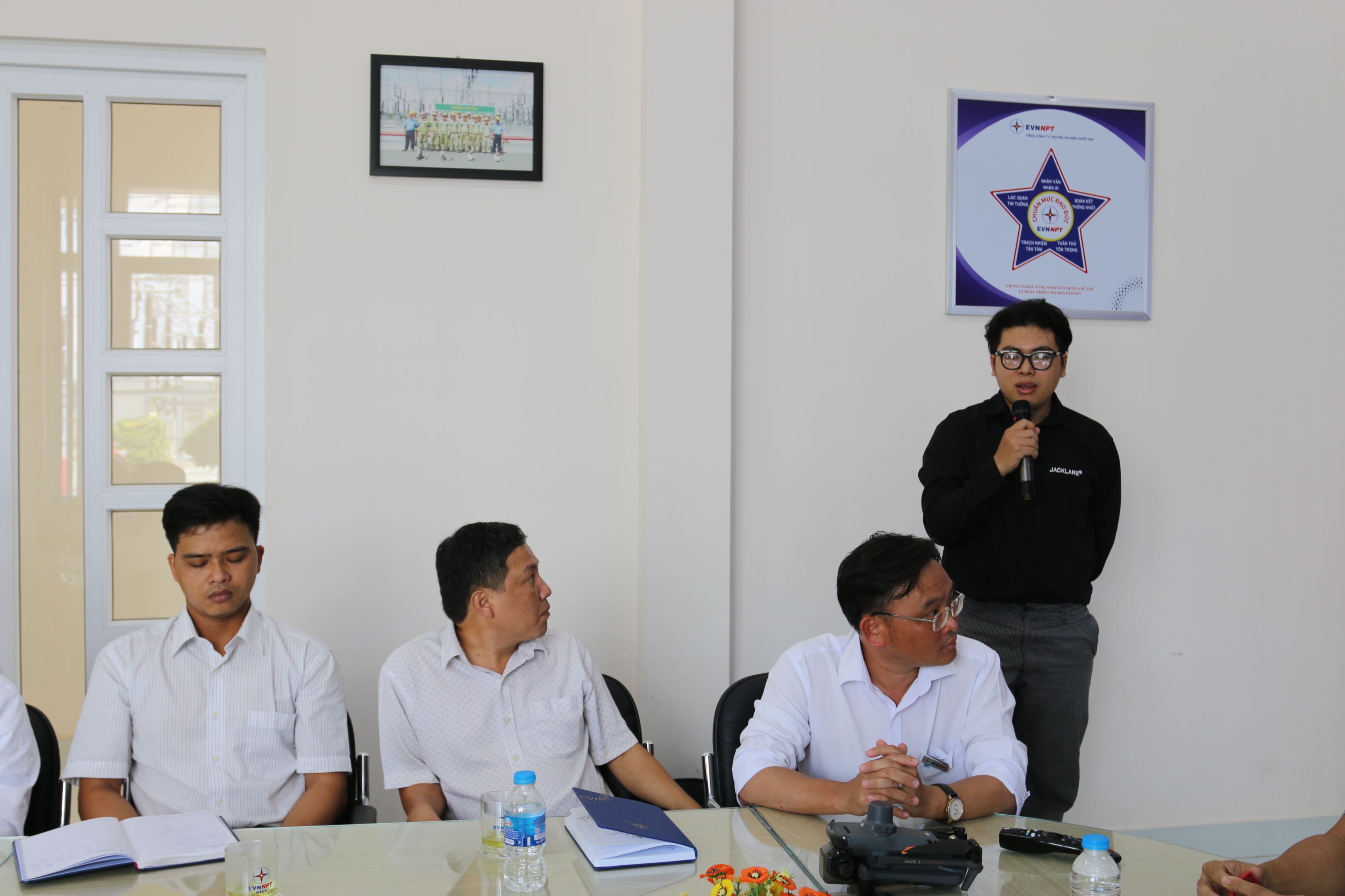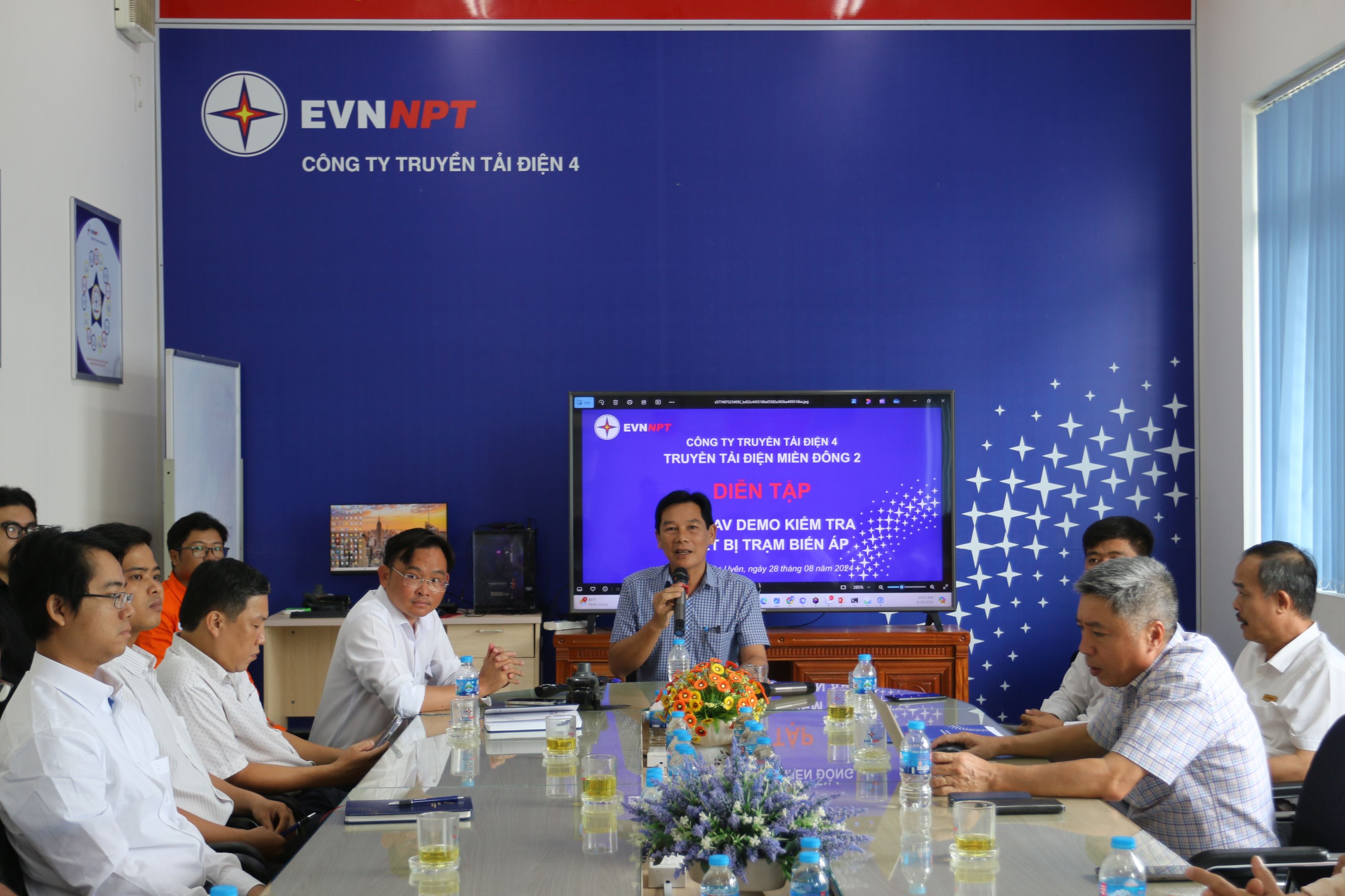 Ông Lê Thế Sỹ - Phó Giám đốc Truyền tải điện Hồ Chí Minh trao đổi một số nội dung thực hiện sử dụng UAV kiểm tra thiết bị trạm biến áp.